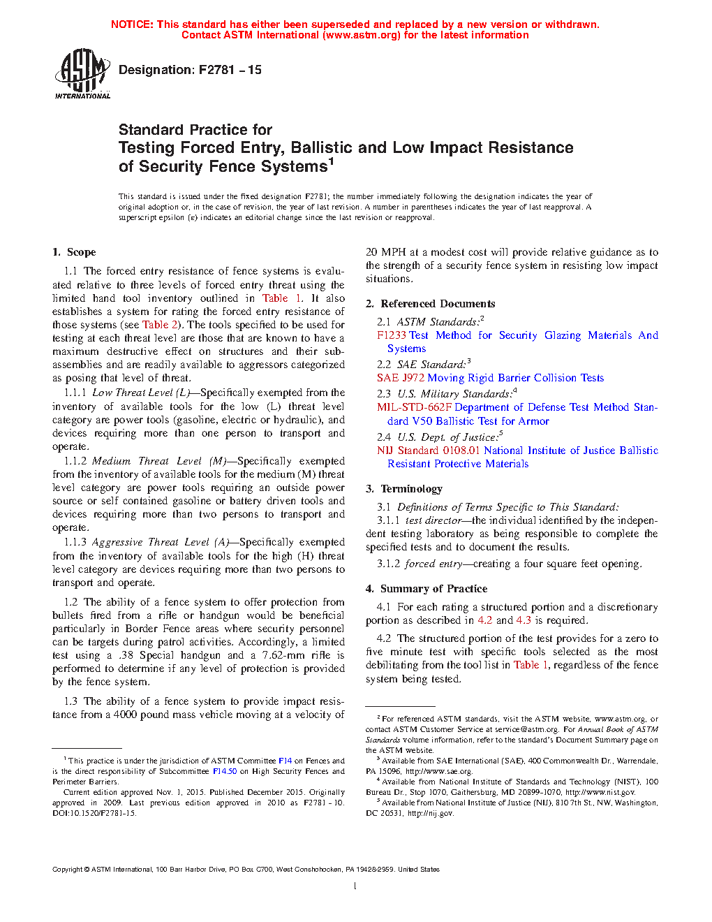 5.2 Normally, a test procedure of this scope would be supported by years of laboratory testing intended to qualify and accurately reproduce the destructive effects of a variety of tools, implements, and devices. However, rapidly changing social conditions have created an immediate need for building components resistant to evolving forced entry techniques. Accordingly, the procedures presented herein are based more on field experience than laboratory analysis. They are more representative than inclusive, are intended to provide a basis for the comparative evaluation of different fence systems using forced penetration procedures, ballistic tests and impact testing, and are not primarily intended to be used to establish or confirm the absolute prevention of forced entries.