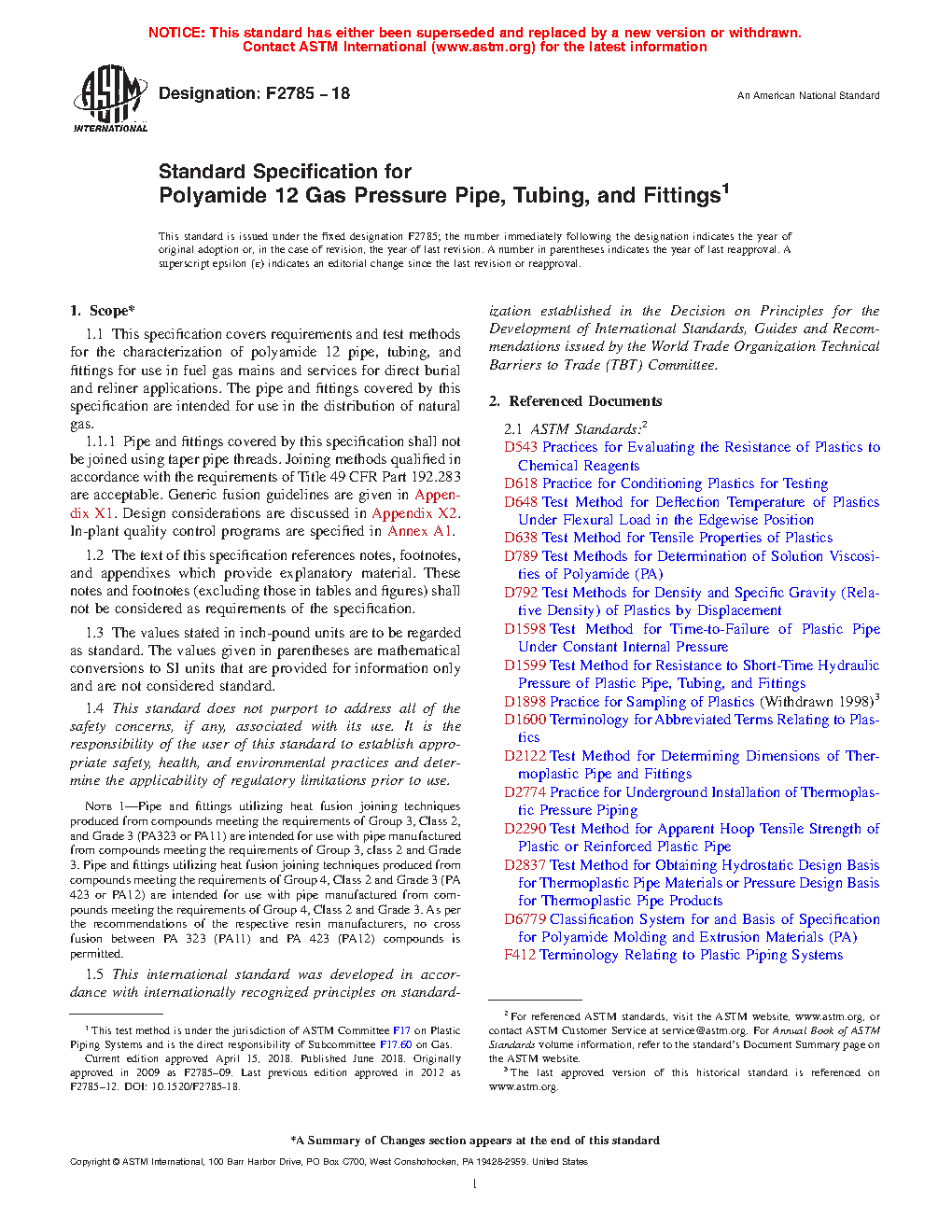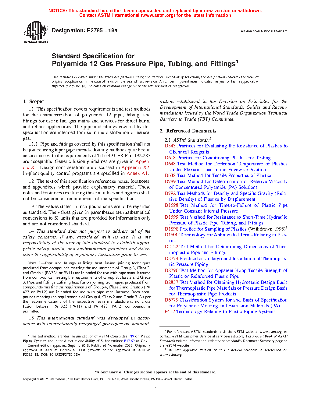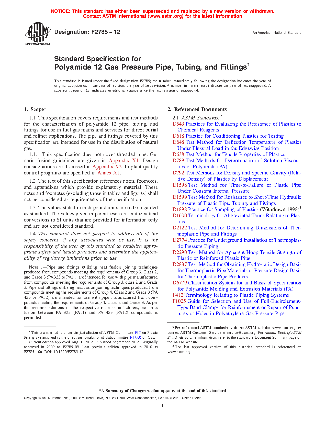1.1 This specification covers requirements and test methods for the characterization of polyamide 12 pipe, tubing, and fittings for use in fuel gas mains and services for direct burial and reliner applications. The pipe and fittings covered by this specification are intended for use in the distribution of natural gas.
