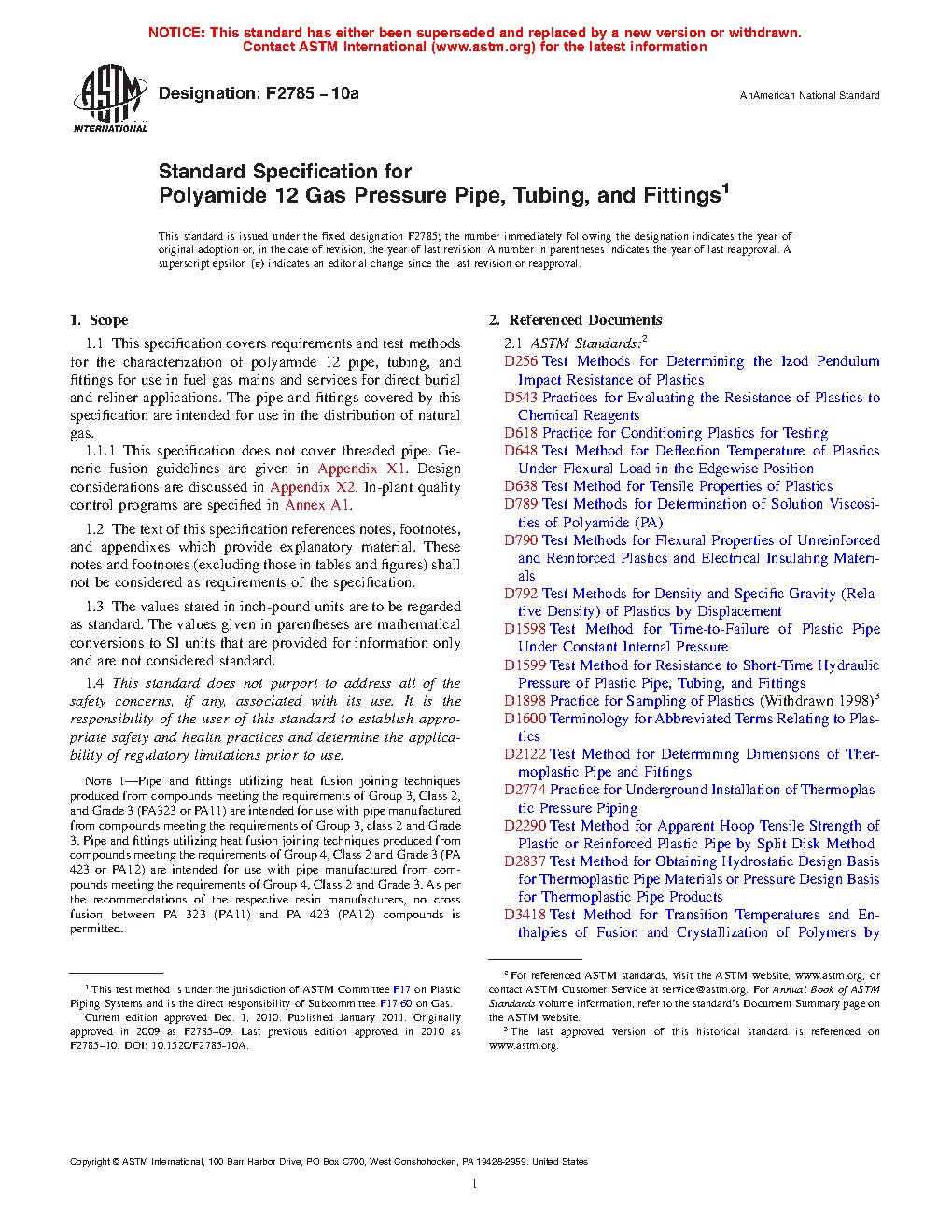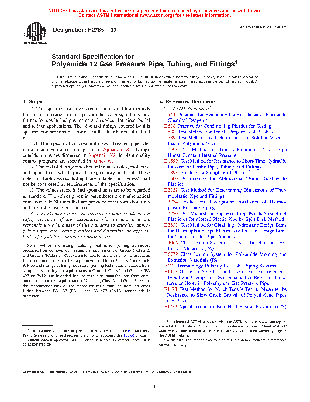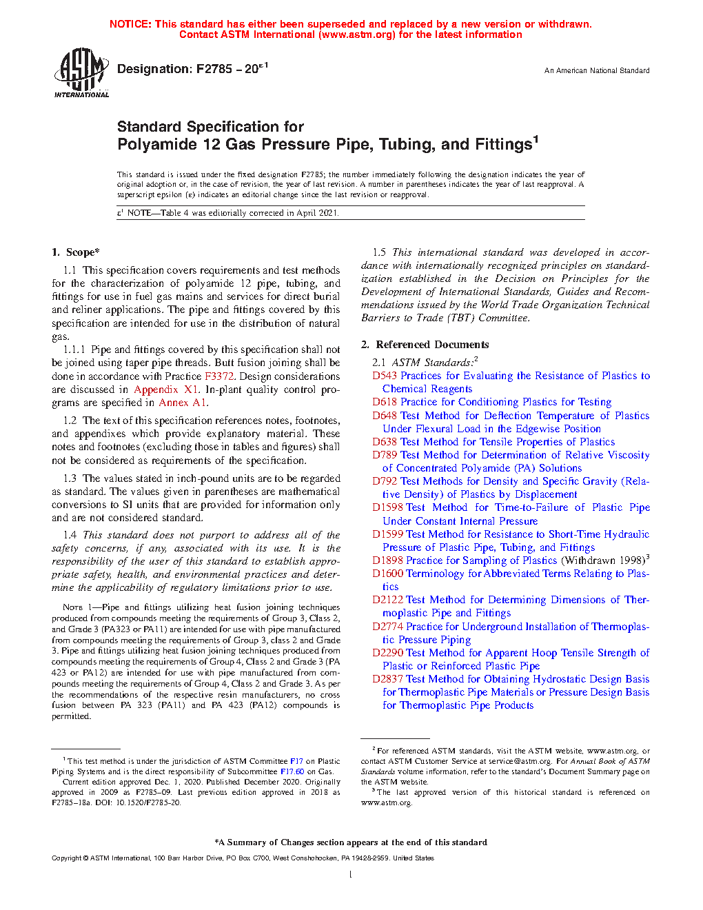 1.1 This specification covers requirements and test methods for the characterization of polyamide 12 pipe, tubing, and fittings for use in fuel gas mains and services for direct burial and reliner applications. The pipe and fittings covered by this specification are intended for use in the distribution of natural gas.