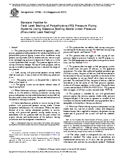1.1 This practice provides information on apparatus, safety, pre-test preparation and procedures for conducting field tests of polyethylene pressure piping systems after installation using gaseous testing media such as unodorized inert non-toxic gas or air, and applying pressure to determine if leaks exist in the system (pneumatic leak testing). This practice applies only to testing to discover leakage. Testing for other purposes such as testing to establish operating pressure is beyond the scope of this practice.