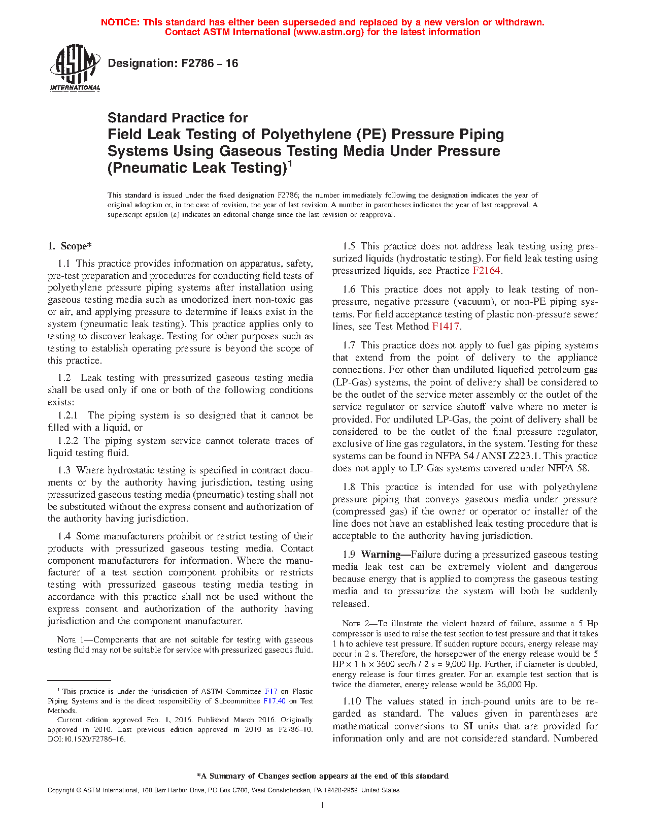 1.8 This practice is intended for use with polyethylene pressure piping that conveys gaseous media under pressure (compressed gas) if the owner or operator or installer of the line does not have an established leak testing procedure that is acceptable to the authority having jurisdiction.