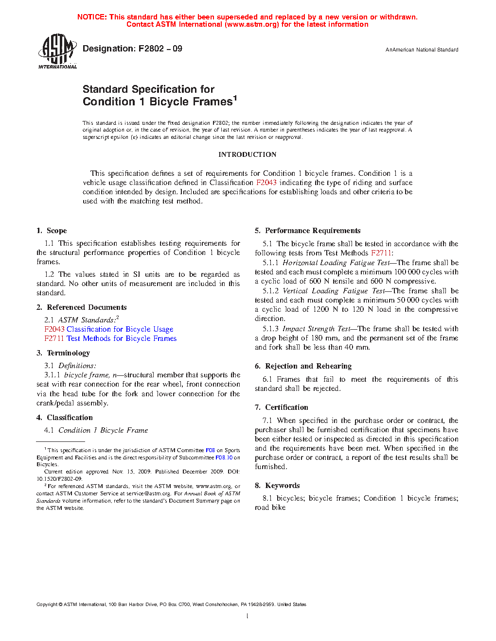 1.1 This specification establishes testing requirements for the structural performance properties of Condition 1 bicycle frames.