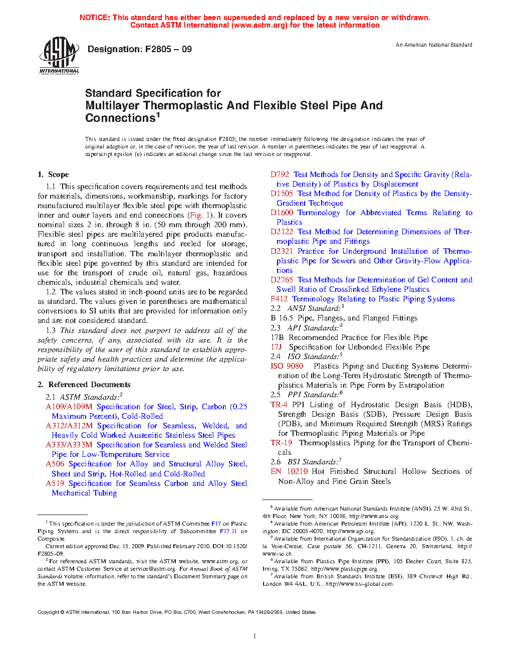 1.1 This specification covers requirements and test methods for materials, dimensions, workmanship, markings for factory manufactured multilayer flexible steel pipe with thermoplastic inner and outer layers and end connections (Fig. 1). It covers nominal sizes 2 in. through 8 in. (50 mm through 200 mm). Flexible steel pipes are multilayered pipe products manufactured in long continuous lengths and reeled for storage, transport and installation. The multilayer thermoplastic and flexible steel pipe governed by this standard are intended for use for the transport of crude oil, natural gas, hazardous chemicals, industrial chemicals and water.