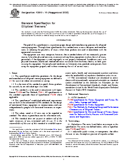 1.1 This specification establishes parameters for the design and manufacture of elliptical training equipment as defined in 3.1 for use in an indoor environment or setting.