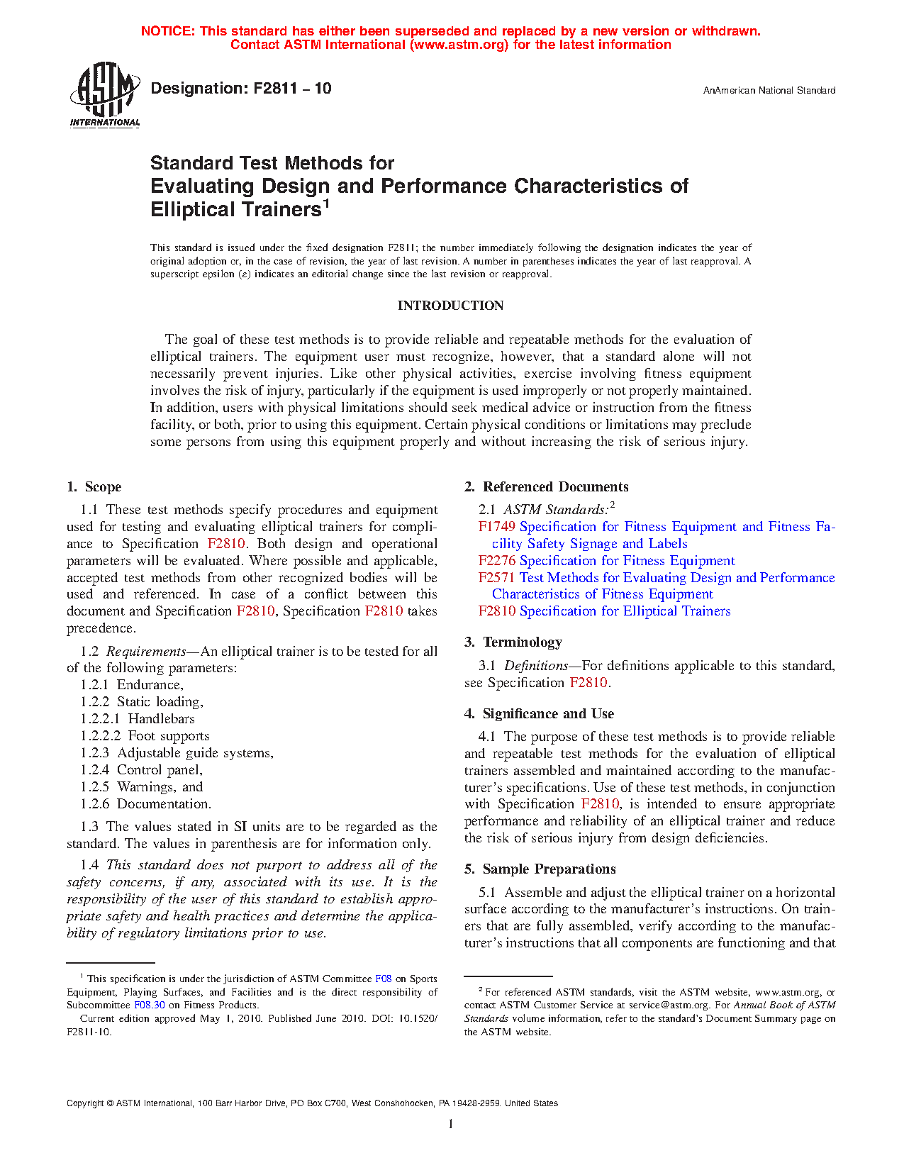 1.1 These test methods specify procedures and equipment used for testing and evaluating elliptical trainers for compliance to Specification F2810. Both design and operational parameters will be evaluated. Where possible and applicable, accepted test methods from other recognized bodies will be used and referenced. In case of a conflict between this document and Specification F2810, Specification F2810 takes precedence.