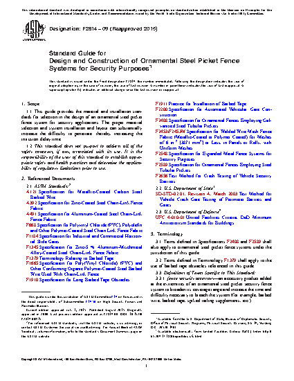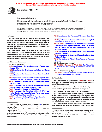 1.1 This guide covers the material and installation standards for selection in the design of an ornamental steel picket fence system for security applications. The proper material selection and system installation and layout can substantially increase the difficulty to penetrate; thereby, increasing the intrusion delay time.