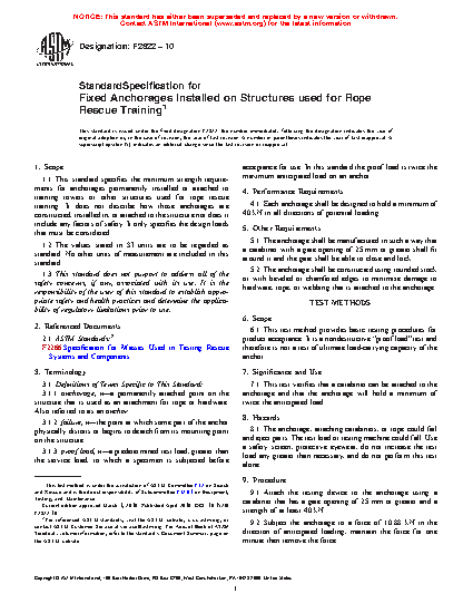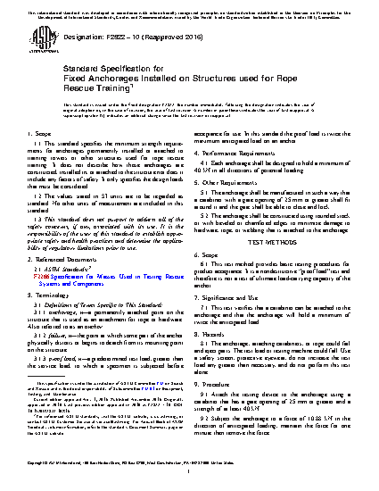 This specification specifies the minimum strength requirements for anchorages permanently installed or attached to training towers or other structures used for rope rescue training. It specifies the design loads that must be considered and does not describe how those anchorages are constructed, installed in, or attached to the structure nor does it include any factors of safety. Each anchorage shall be designed to hold a minimum of 40 kN in all directions of potential loading and shall be manufactured in such a way that a carabiner with a gate opening of 25 mm or greater shall fit around it and the gate shall be able to close and lock. The anchorage shall be constructed using rounded stock or with beveled or chamfered edges to minimize damage to hardware, rope, or webbing that is attached to the anchorage.