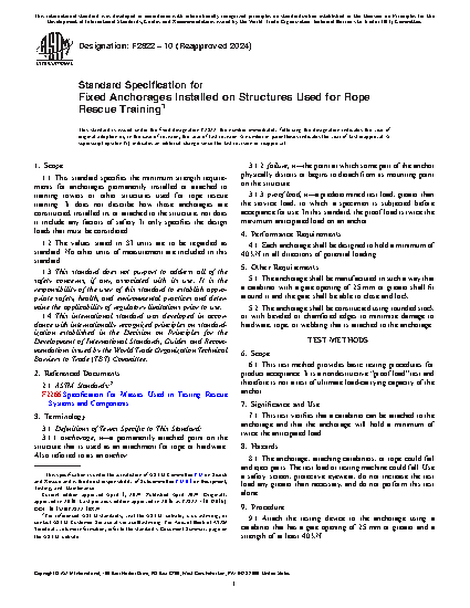1.1 This standard specifies the minimum strength requirements for anchorages permanently installed or attached to training towers or other structures used for rope rescue training. It does not describe how those anchorages are constructed, installed in, or attached to the structure, nor does it include any factors of safety. It only specifies the design loads that must be considered.