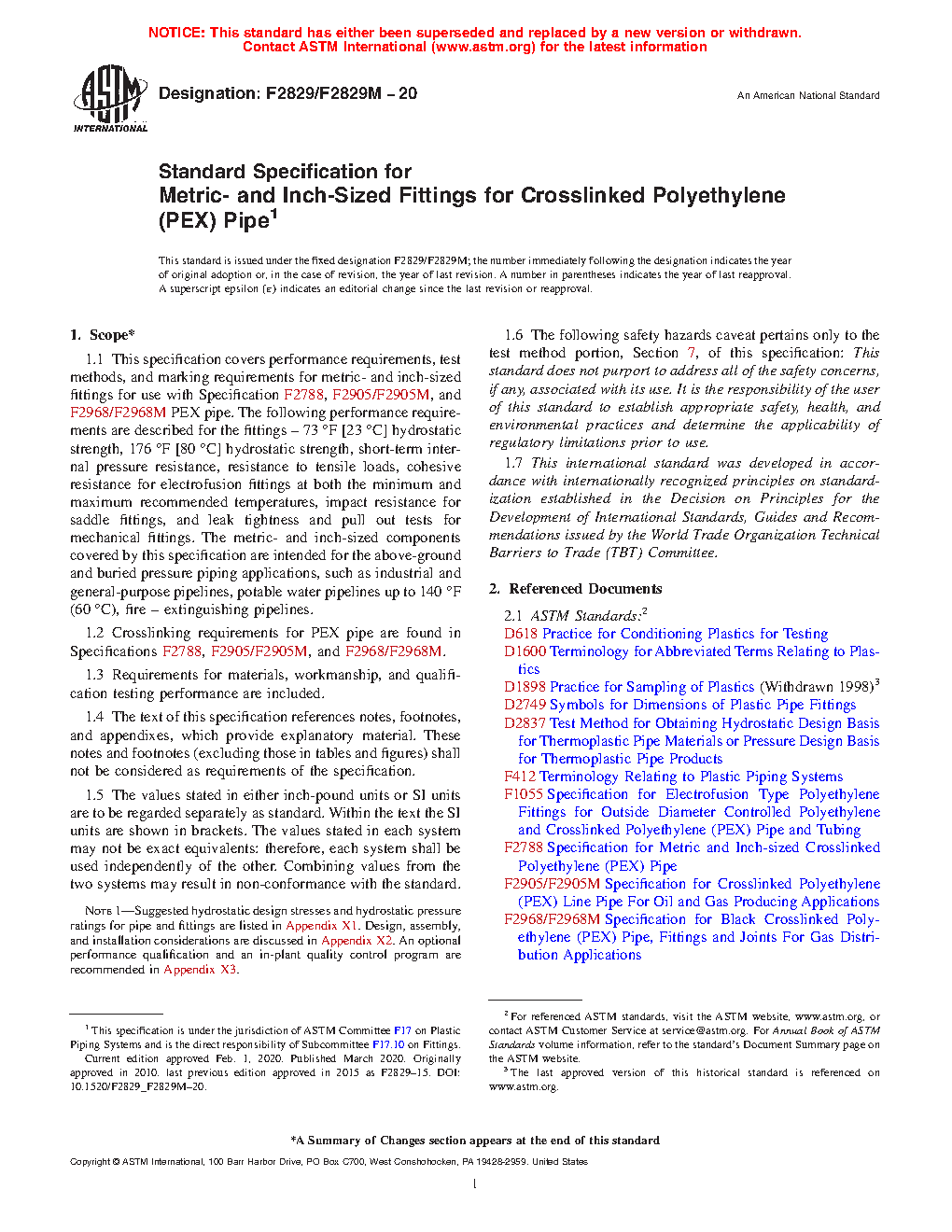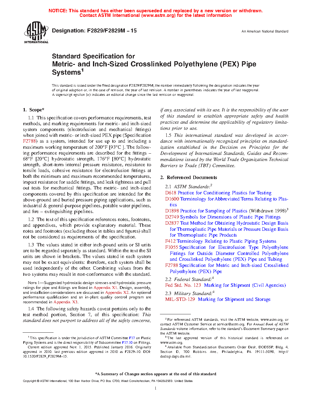 Note 1: Suggested hydrostatic design stresses and hydrostatic pressure ratings for pipe and fittings are listed in Appendix X1. Design, assembly, and installation considerations are discussed in Appendix X2. An optional performance qualification and an in-plant quality control program are recommended in Appendix X3.