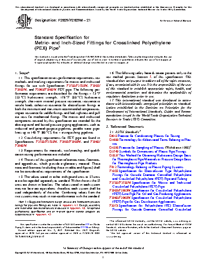 1.1 This specification covers performance requirements, test methods, and marking requirements for metric- and inch-sized system components (electrofusion and mechanical fittings) when joined with metric- or inch-sized PEX pipe (Specification F2788) as a system, intended for use up to and including a maximum working temperature of 200°F [93°C ]. The following performance requirements are described for the fittings – 68°F [20°C] hydrostatic strength, 176°F [80°C] hydrostatic strength, short-term internal pressure resistance, resistance to tensile loads, cohesive resistance for electrofusion fittings at both the minimum and maximum recommended temperatures, impact resistance for saddle fittings, and leak tightness and pull out tests for mechanical fittings. The metric- and inch-sized components covered by this specification are intended for the above-ground and buried pressure piping applications, such as industrial & general-purpose pipelines, potable water pipelines, and fire – extinguishing pipelines.