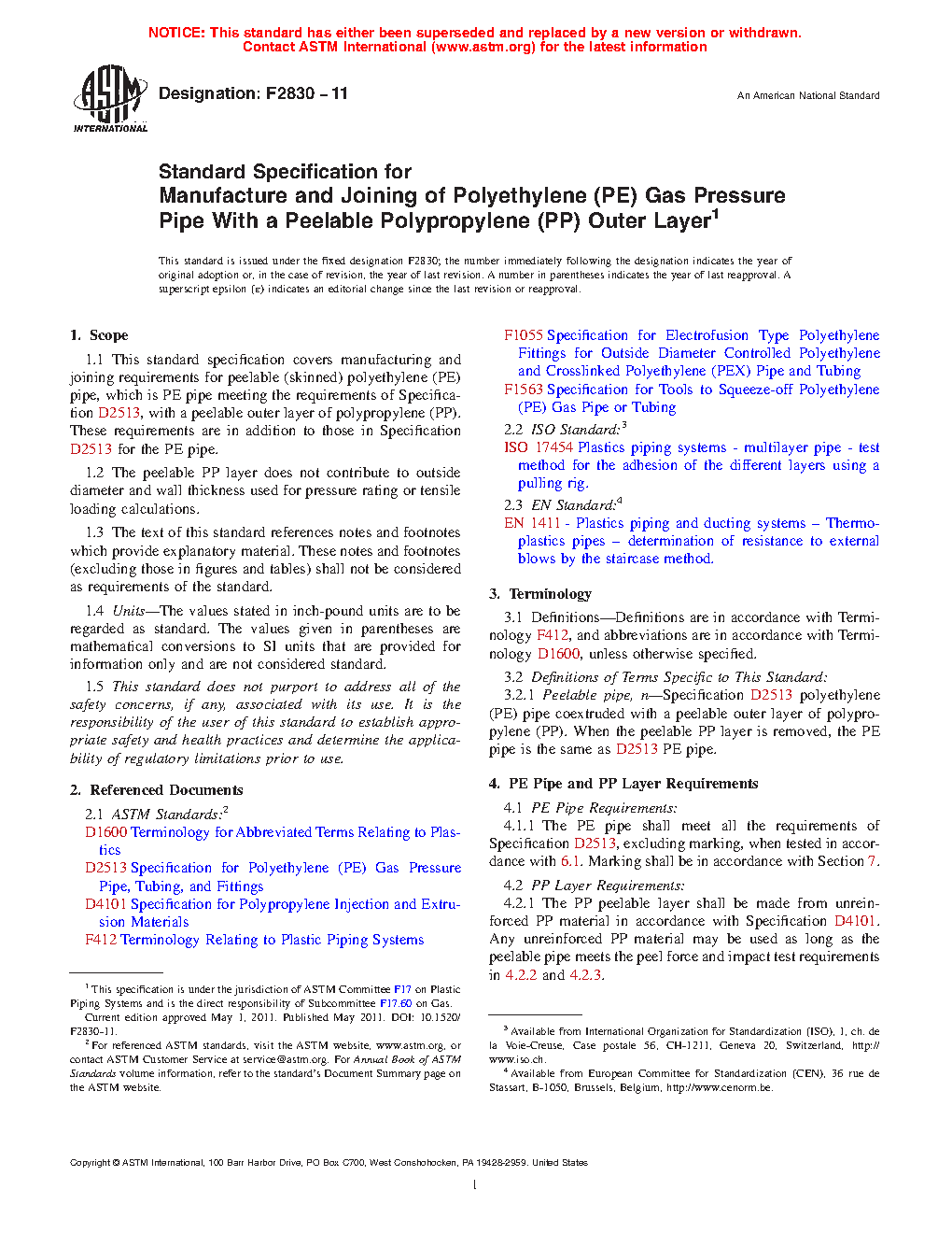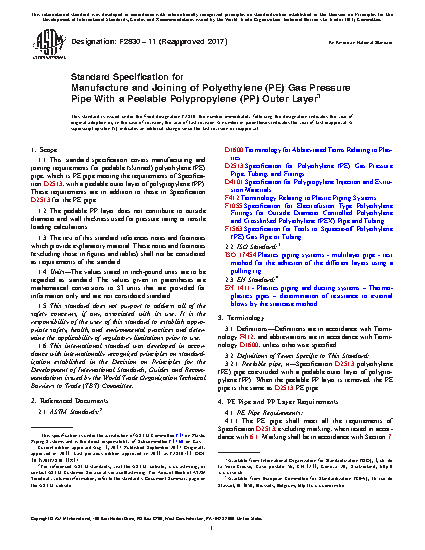 1.1 This standard specification covers manufacturing and joining requirements for peelable (skinned) polyethylene (PE) pipe, which is PE pipe meeting the requirements of Specification D2513, with a peelable outer layer of polypropylene (PP). These requirements are in addition to those in Specification D2513 for the PE pipe.