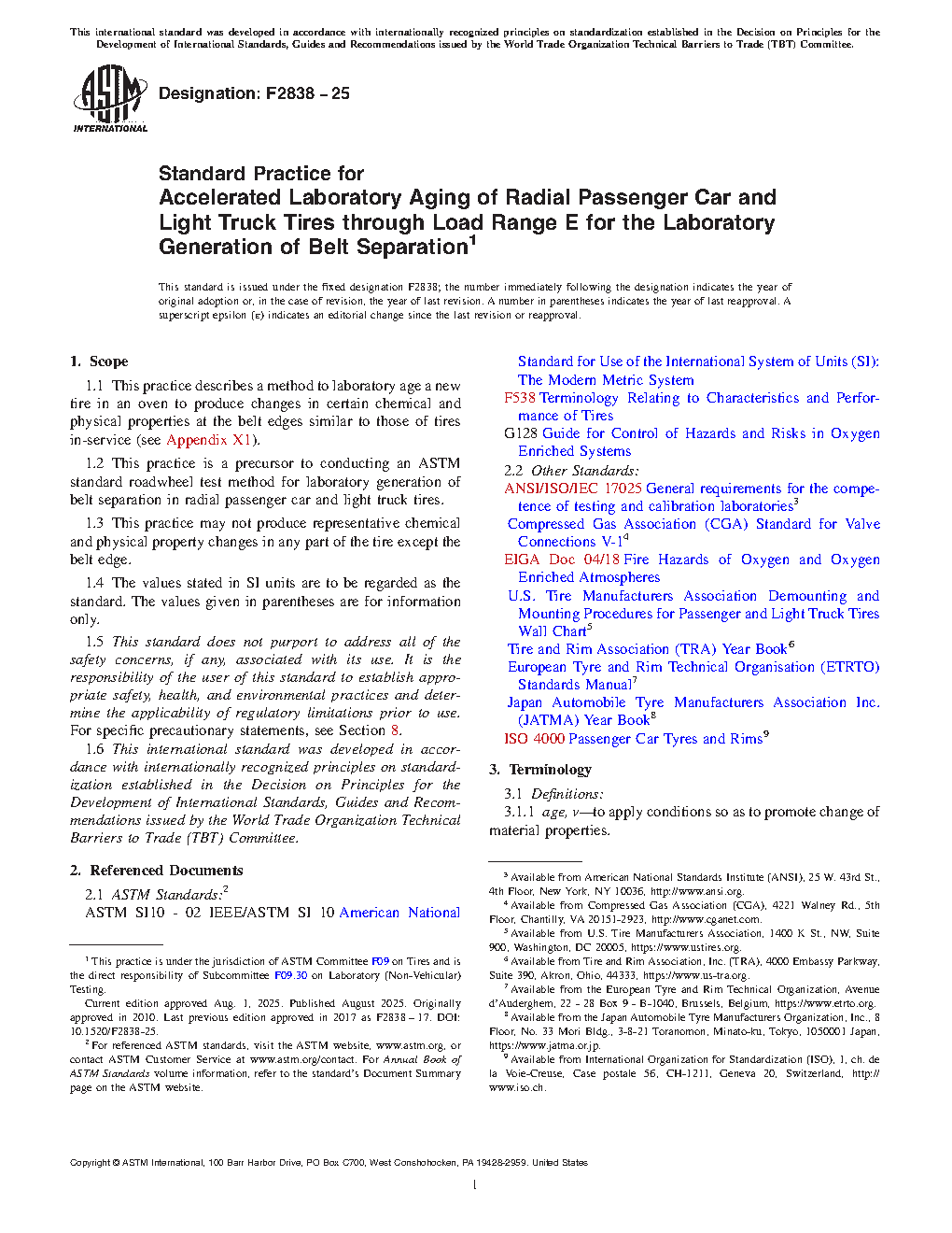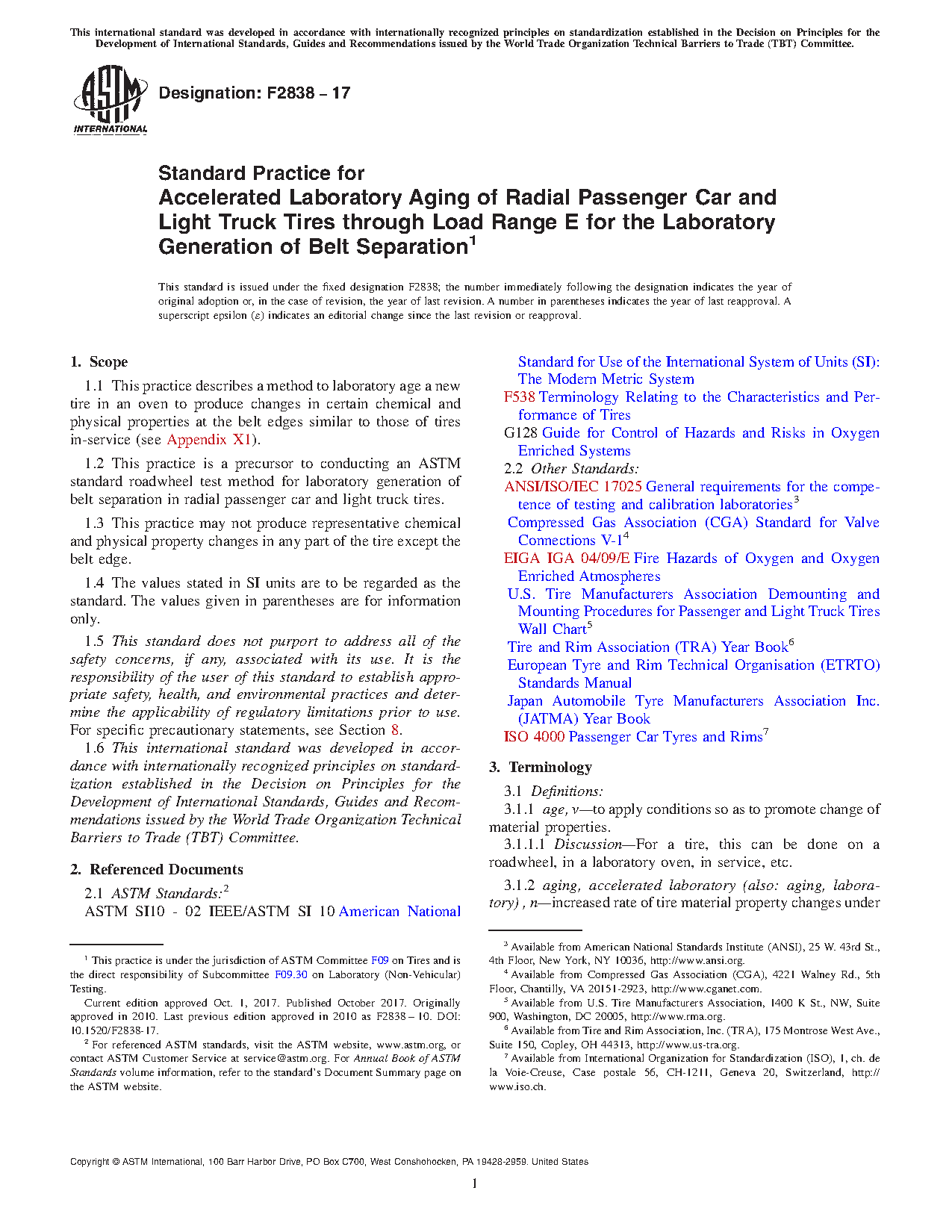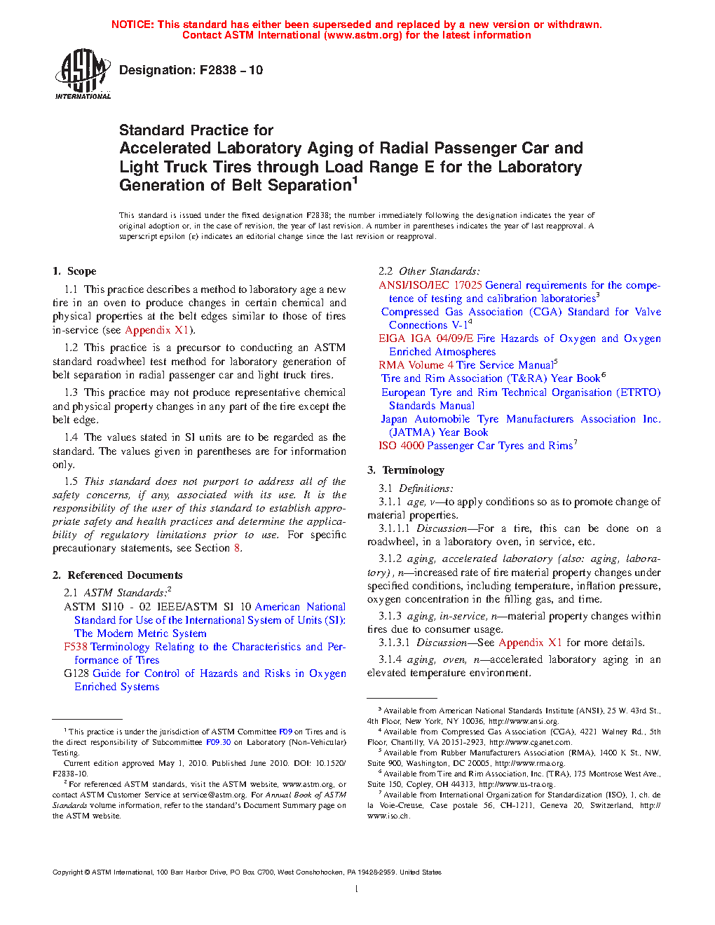 1.1 This practice describes a method to laboratory age a new tire in an oven to produce changes in certain chemical and physical properties at the belt edges similar to those of tires in-service (see Appendix X1).