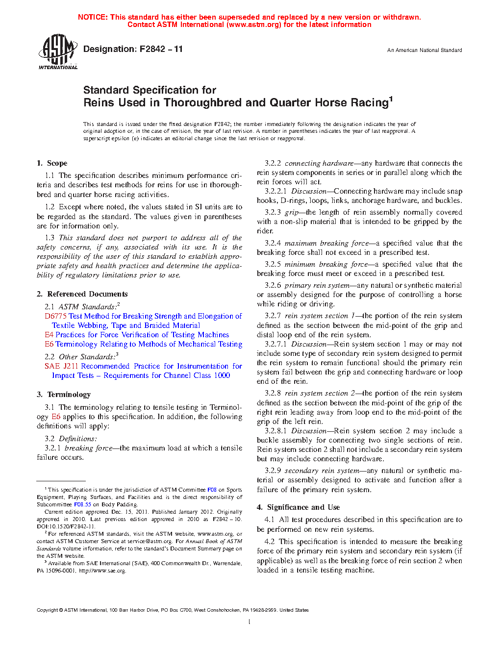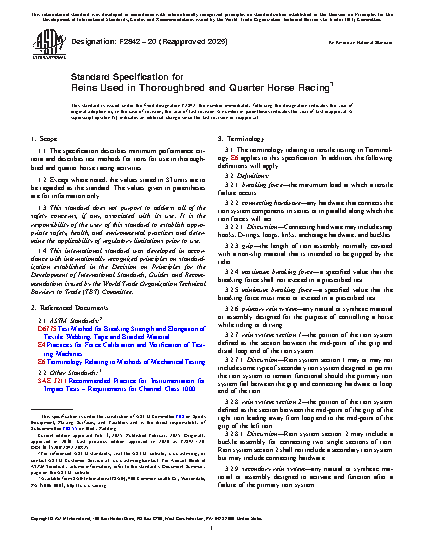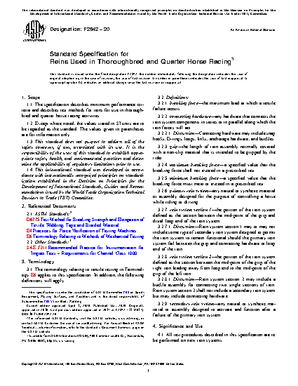 1.1 The specification describes minimum performance criteria and describes test methods for reins for use in thoroughbred and quarter horse racing activities.