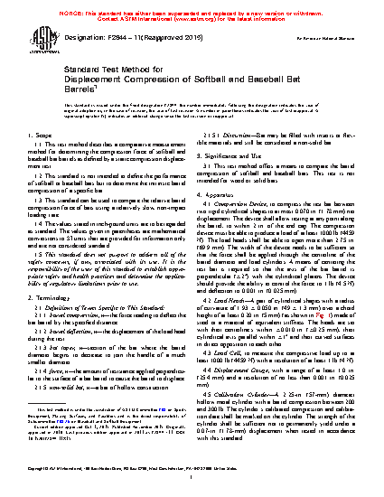 1.1 This test method describes a comparative measurement method for determining the compression force of softball and baseball bat barrels as defined by a static compression displacement test.
