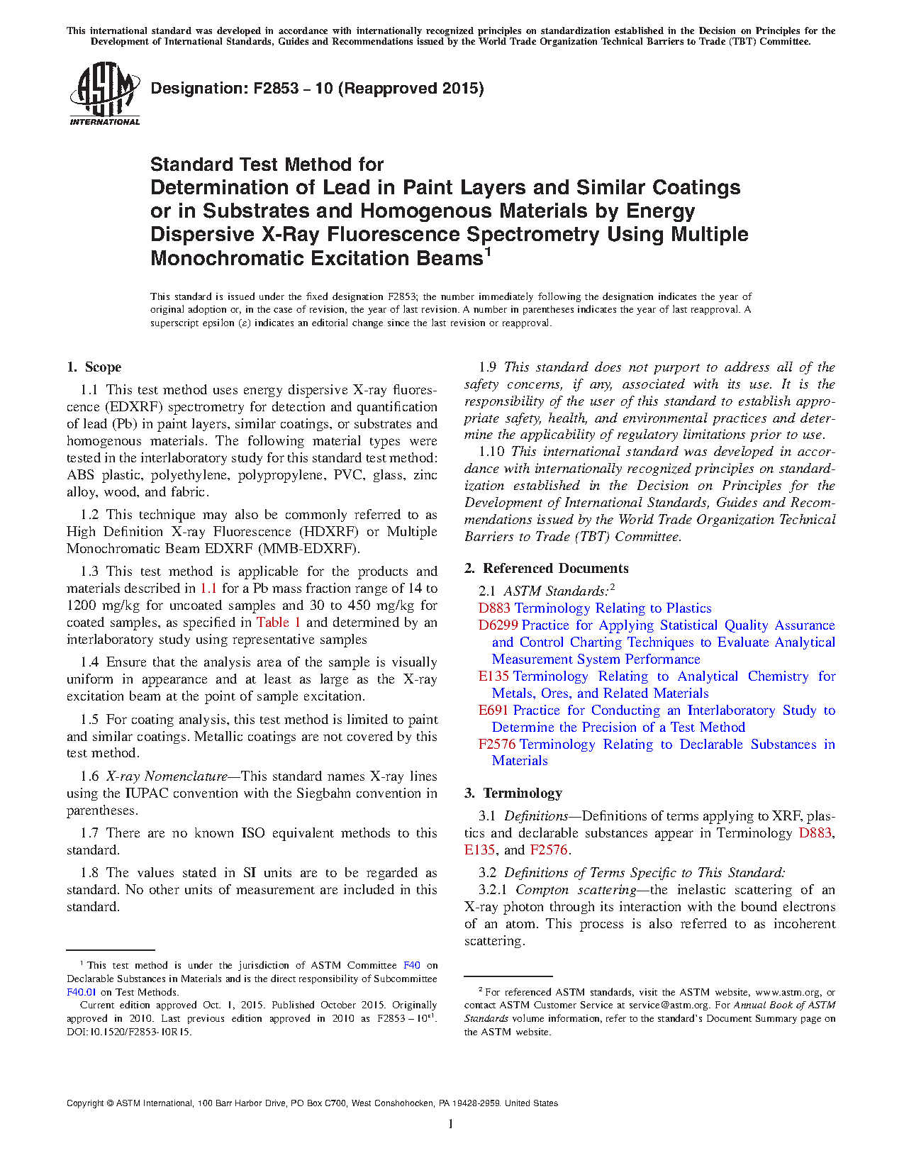 This test method may be used for quantitative determinations of Pb in painted and unpainted articles such as toys, children’s products, and other consumer products. Typical test time for quantification of Pb in homogenous samples is 1 to 3 min; and typical test time for quantification of Pb in paint is 4 to 8 min.