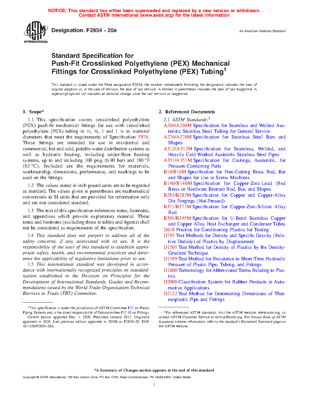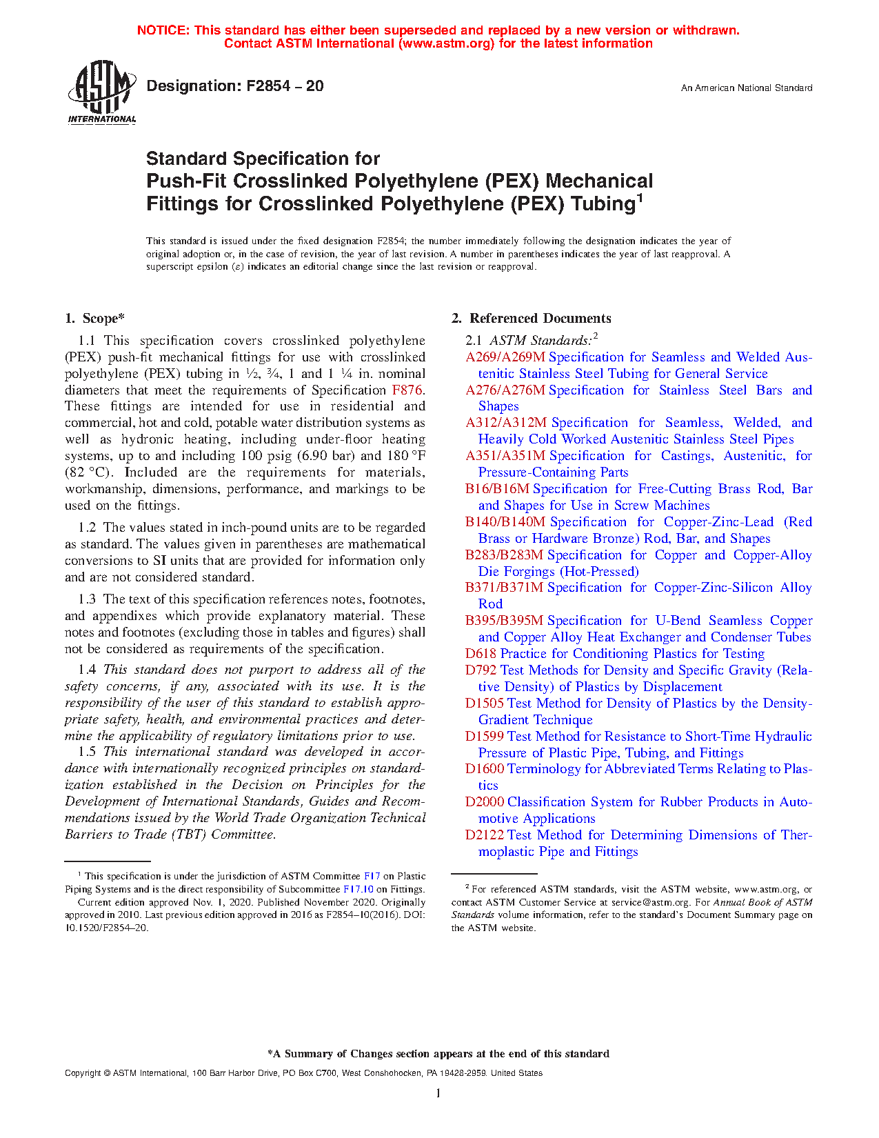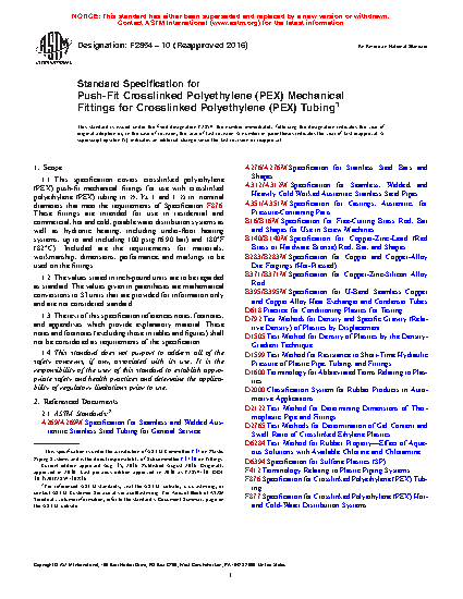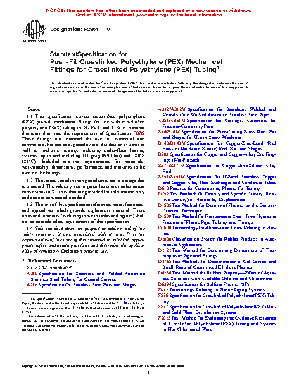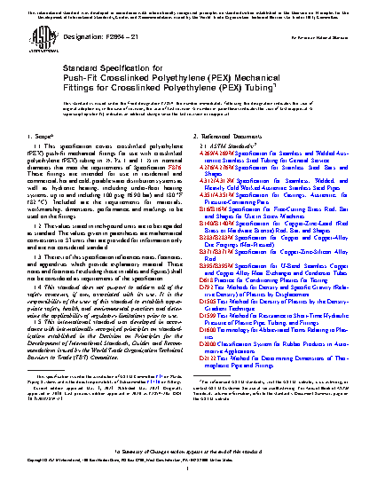 This specification covers crosslinked polyethylene (PEX) push-fit mechanical fittings for use with crosslinked polyethylene (PEX) tubing that meet the requirements of Specification F876. These fittings are intended for use in residential and commercial, hot and cold, potable water distribution systems as well as hydronic heating, including under-floor heating systems. Included are the requirements for materials, workmanship, dimensions, performance, and markings to be used on the fittings.