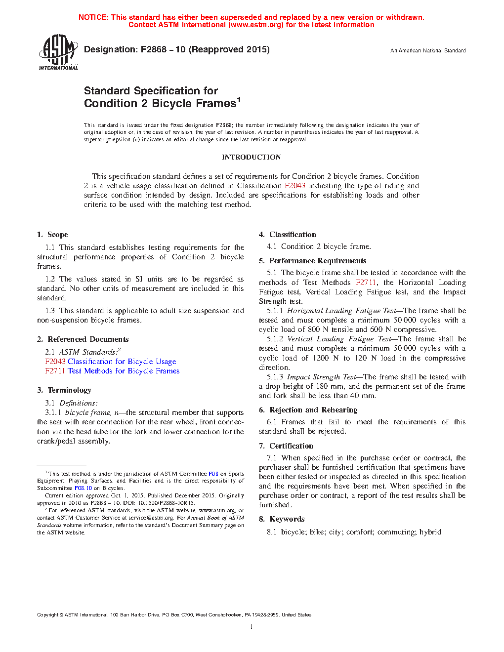 This specification covers general testing requirements for the structural performance properties of Condition bicycle frames. Included are requirements for establishing loads and other criteria to be used with the matching test method. Performance requirements for the bicycle frame shall be in accordance with the methods of Test Methods F2711 which include the Horizontal Loading Fatigue Test, Vertical Loading Fatigue Test, and the Impact Strength Test.