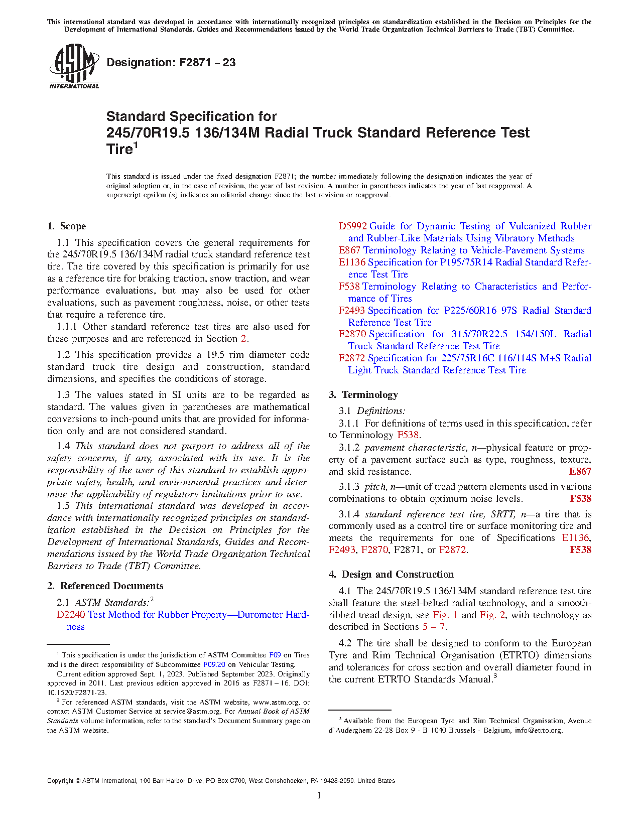 1.1 This specification covers the general requirements for the 245/70R19.5 136/134M radial truck standard reference test tire. The tire covered by this specification is primarily for use as a reference tire for braking traction, snow traction, and wear performance evaluations, but may also be used for other evaluations, such as pavement roughness, noise, or other tests that require a reference tire.