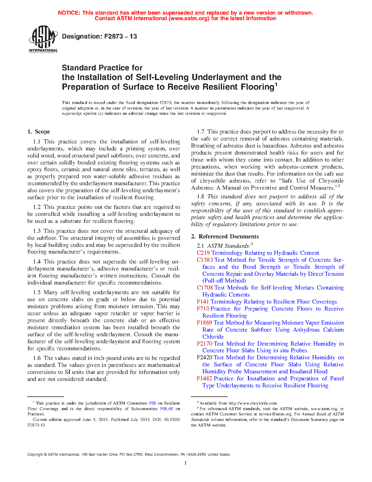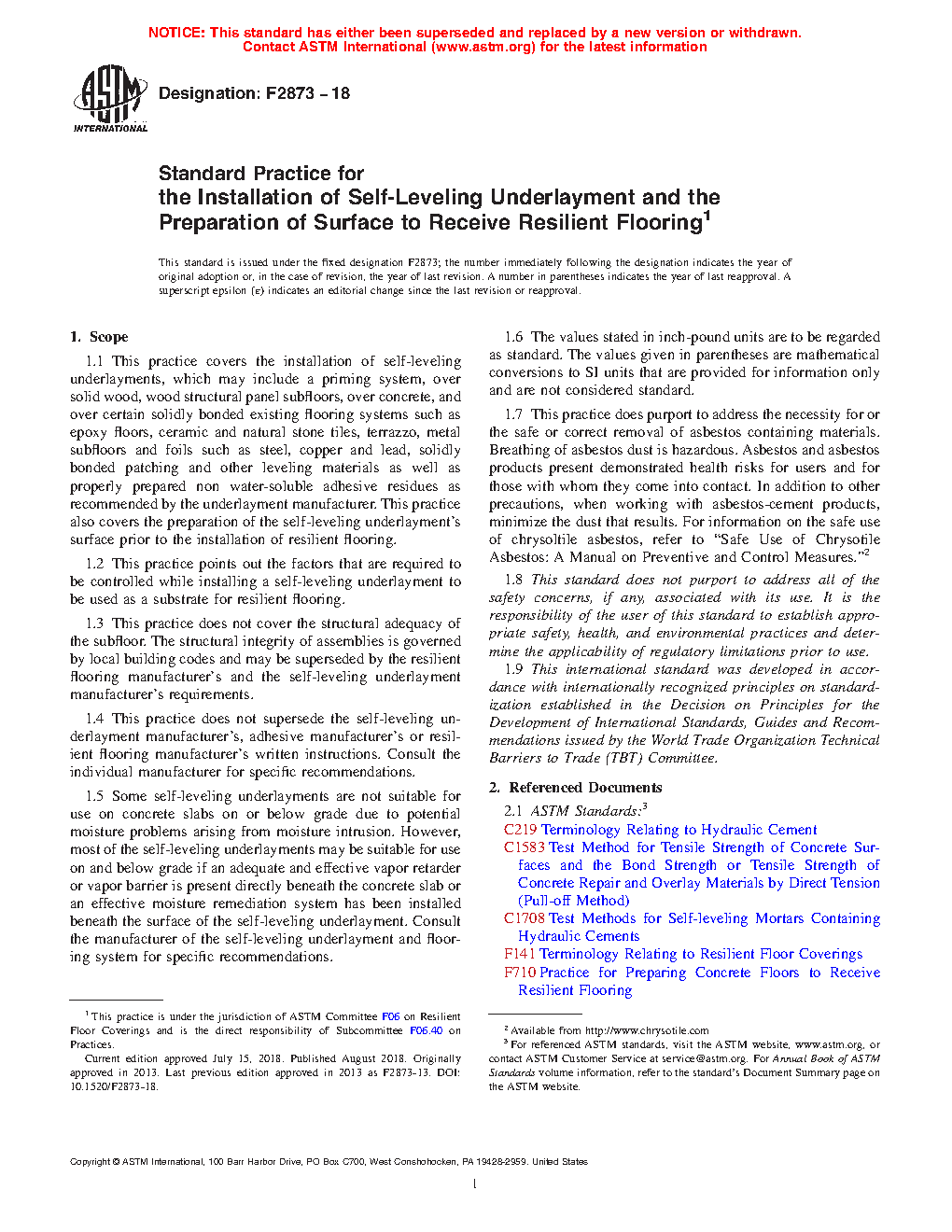 4.1 This practice provides minimum recommendations for the installation of self-leveling underlayments suitable to receive resilient floor coverings. This practice establishes the proper preparation of the subfloor, and installation methods and quality control requirements for self-leveling underlayments. This practice addresses any necessary preparation of the self-leveling underlayment’s surface prior to the installation of floor coverings.