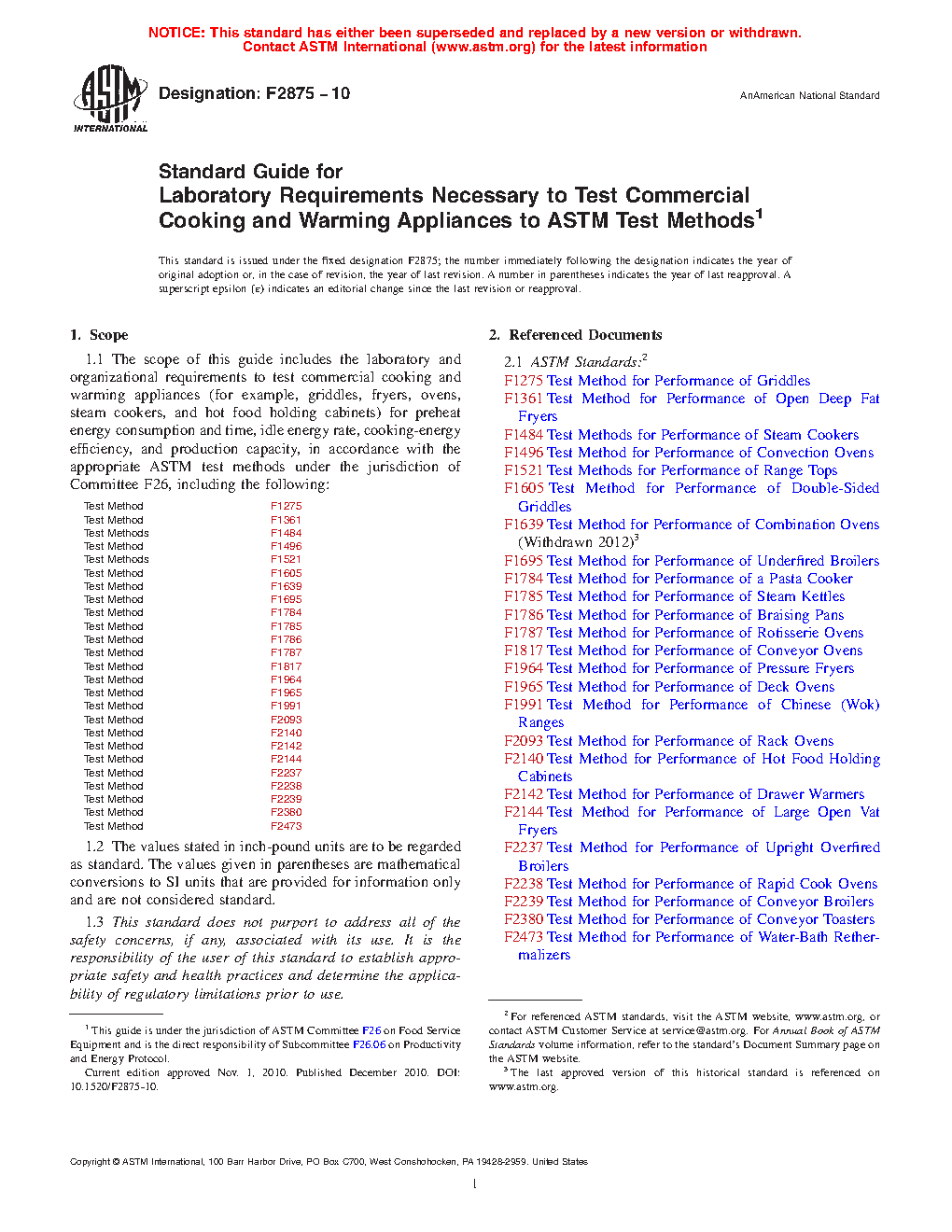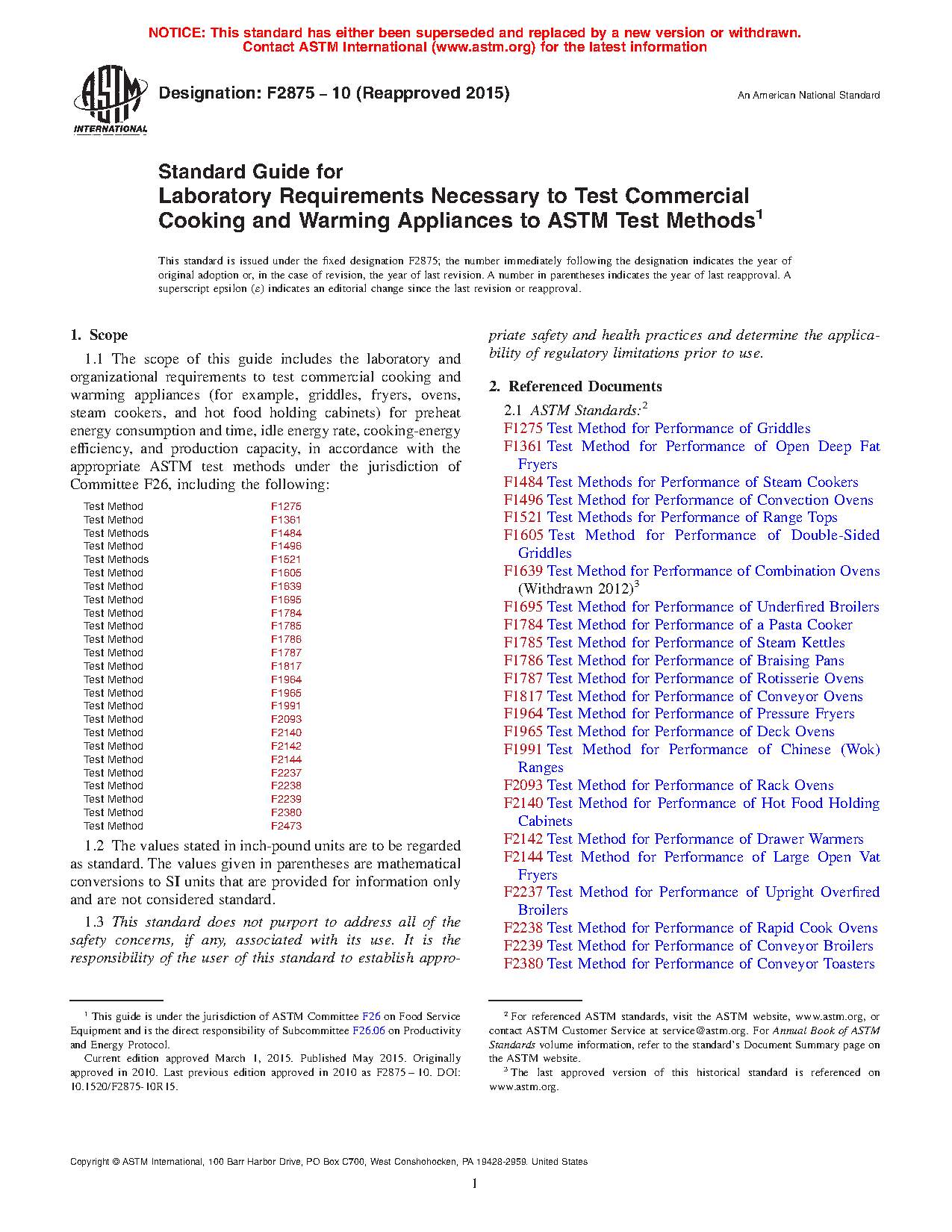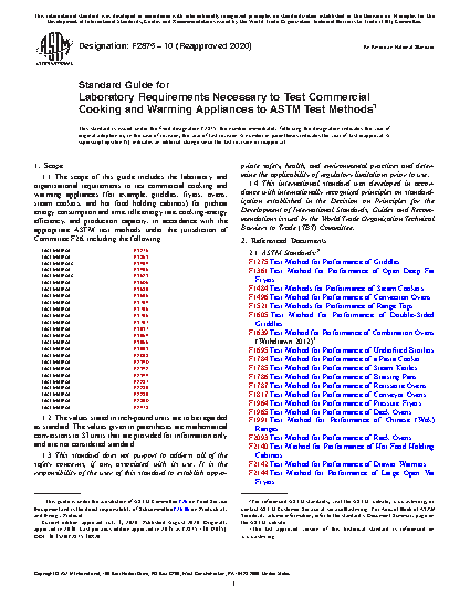 1.1 The scope of this guide includes the laboratory and organizational requirements to test commercial cooking and warming appliances (for example, griddles, fryers, ovens, steam cookers, and hot food holding cabinets) for preheat energy consumption and time, idle energy rate, cooking-energy efficiency, and production capacity, in accordance with the appropriate ASTM test methods under the jurisdiction of Committee F26, including the following:
