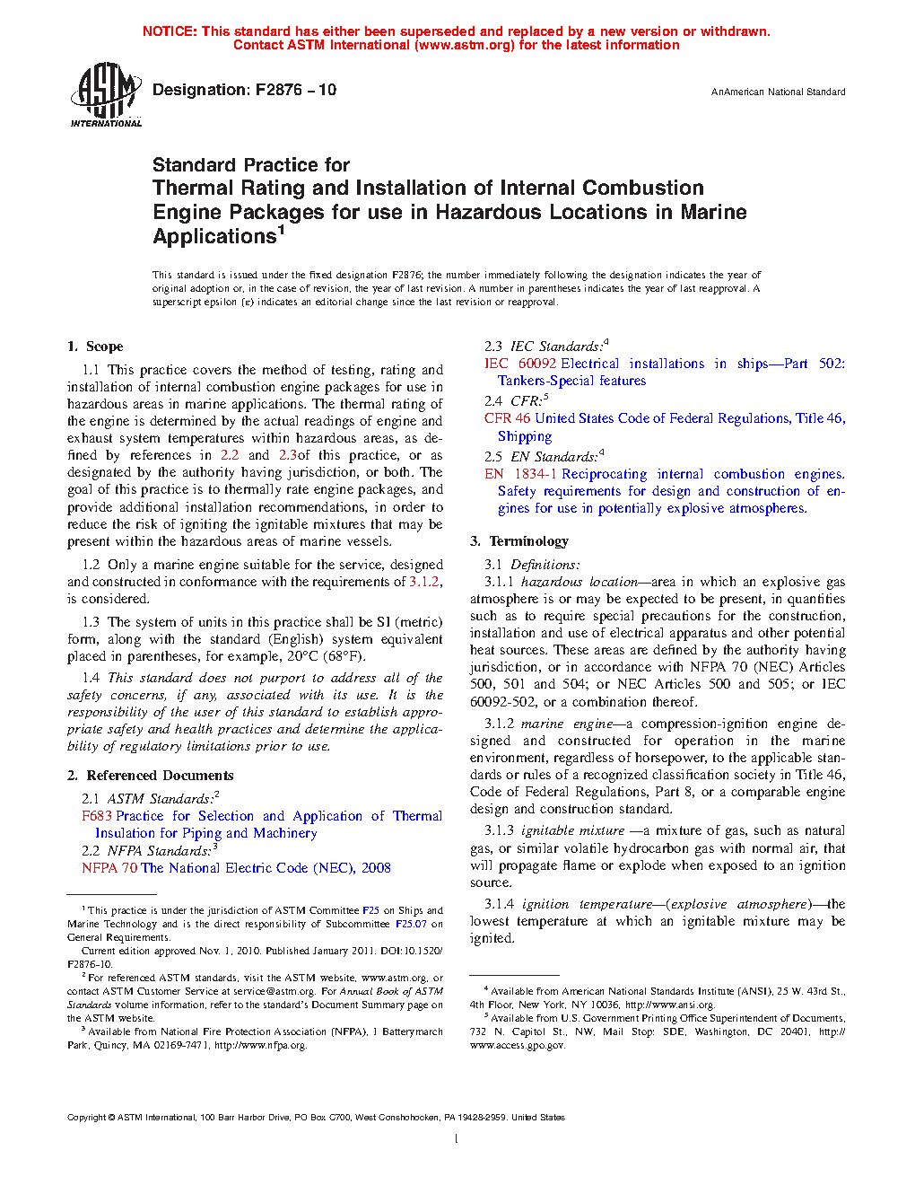 1.1 This practice covers the method of testing, rating and installation of internal combustion engine packages for use in hazardous areas in marine applications. The thermal rating of the engine is determined by the actual readings of engine and exhaust system temperatures within hazardous areas, as defined by references in 2.2 and 2.3of this practice, or as designated by the authority having jurisdiction, or both. The goal of this practice is to thermally rate engine packages, and provide additional installation recommendations, in order to reduce the risk of igniting the ignitable mixtures that may be present within the hazardous areas of marine vessels.