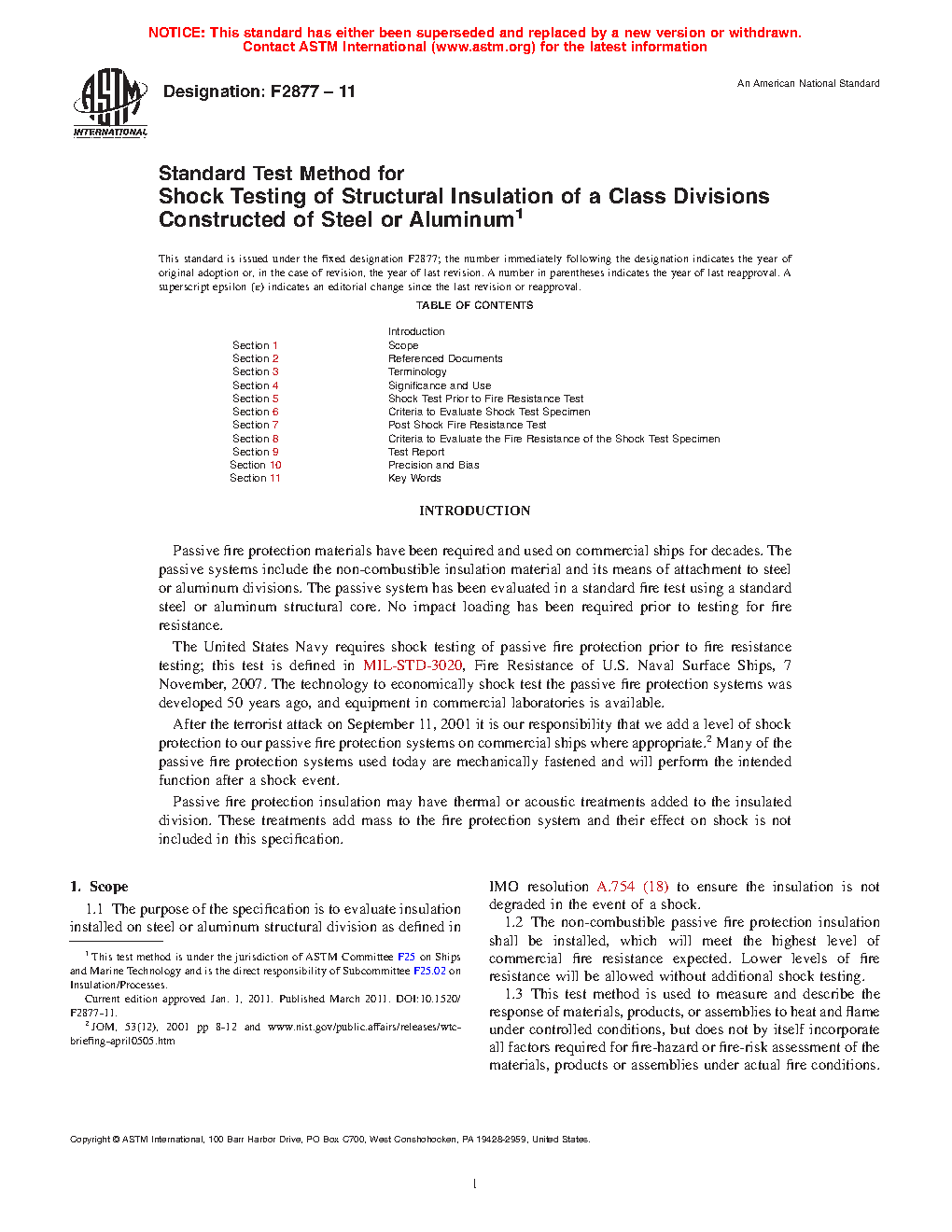 1.1 The purpose of the specification is to evaluate insulation installed on steel or aluminum structural division as defined in IMO resolution A.754 (18) to ensure the insulation is not degraded in the event of a shock.