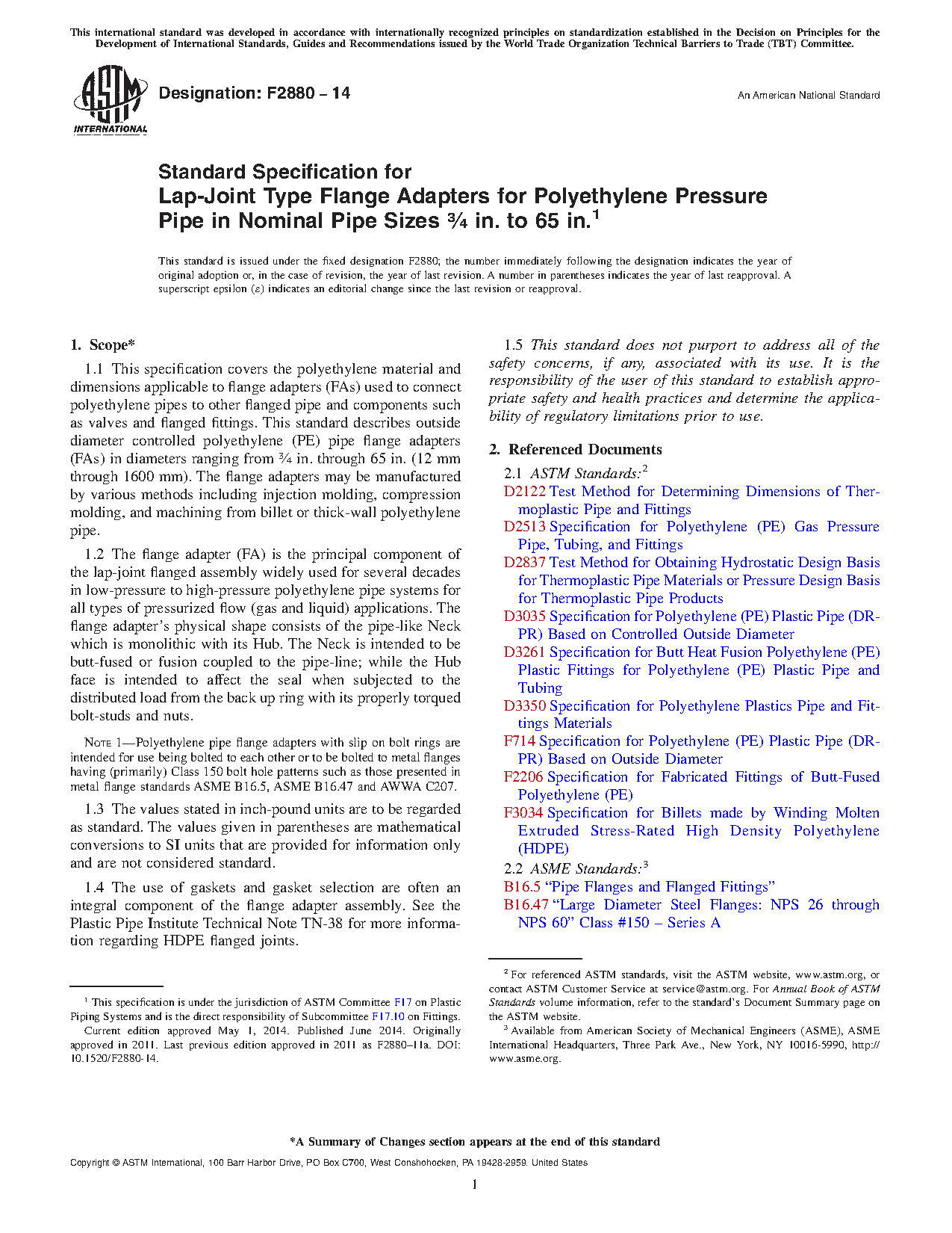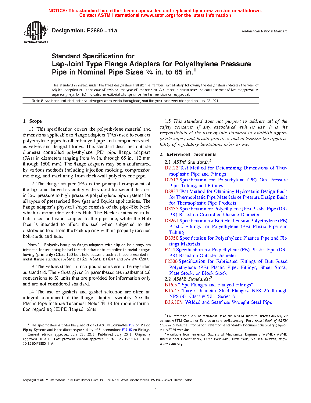 This specification covers the polyethylene material and dimensions applicable to flange adapters (FAs) used to connect polyethylene pipes to other flanged pipe and components such as valves and flanged fittings. It describes outside diameter controlled polyethylene (PE) pipe FAs which may be manufactured by various methods including injection molding, compression molding, and machining from thick-wall polyethylene pipe.