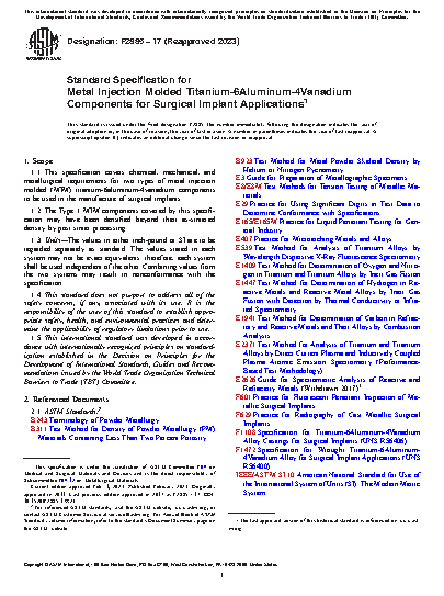1.1 This specification covers chemical, mechanical, and metallurgical requirements for two types of metal injection molded (MIM) titanium-6aluminum-4vanadium components to be used in the manufacture of surgical implants.