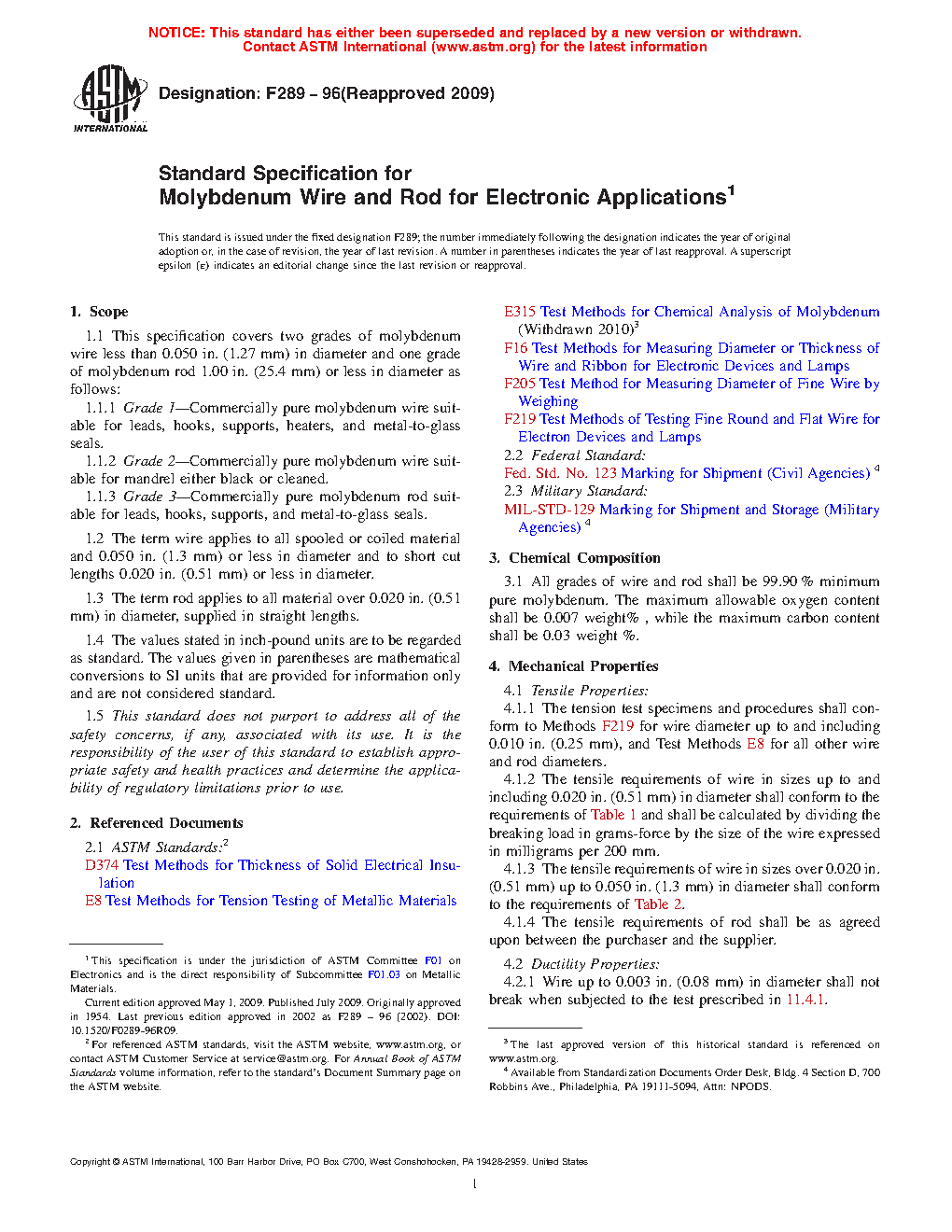 1.1 This specification covers two grades of molybdenum wire less than 0.050 in. (1.27 mm) in diameter and one grade of molybdenum rod 1.00 in. (25.4 mm) or less in diameter as follows: