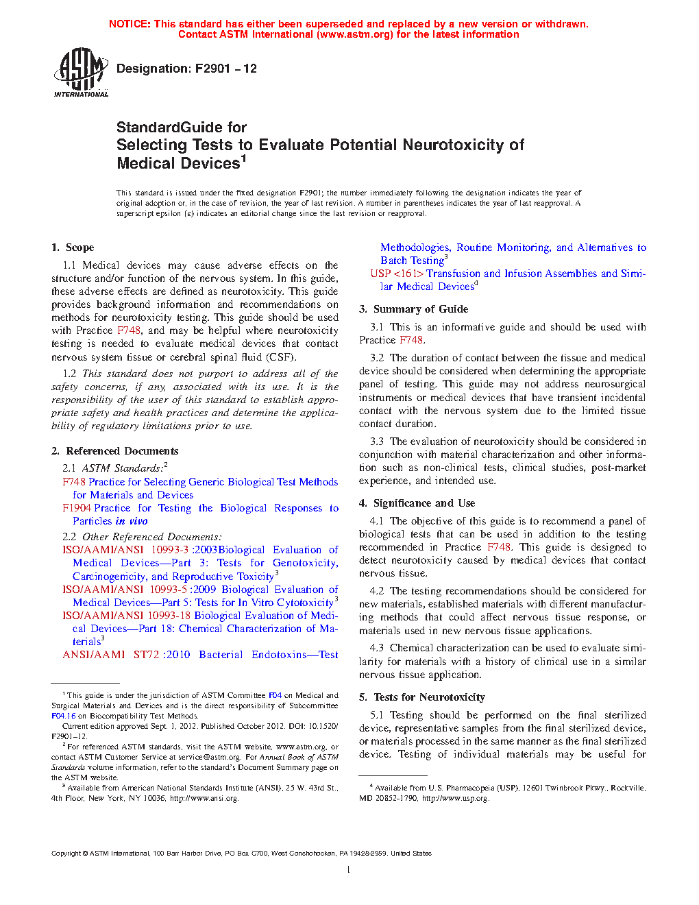 1.1 Medical devices may cause adverse effects on the structure and/or function of the nervous system. In this guide, these adverse effects are defined as neurotoxicity. This guide provides background information and recommendations on methods for neurotoxicity testing. This guide should be used with Practice F748, and may be helpful where neurotoxicity testing is needed to evaluate medical devices that contact central and/or peripheral nervous system tissue or cerebral spinal fluid (CSF).