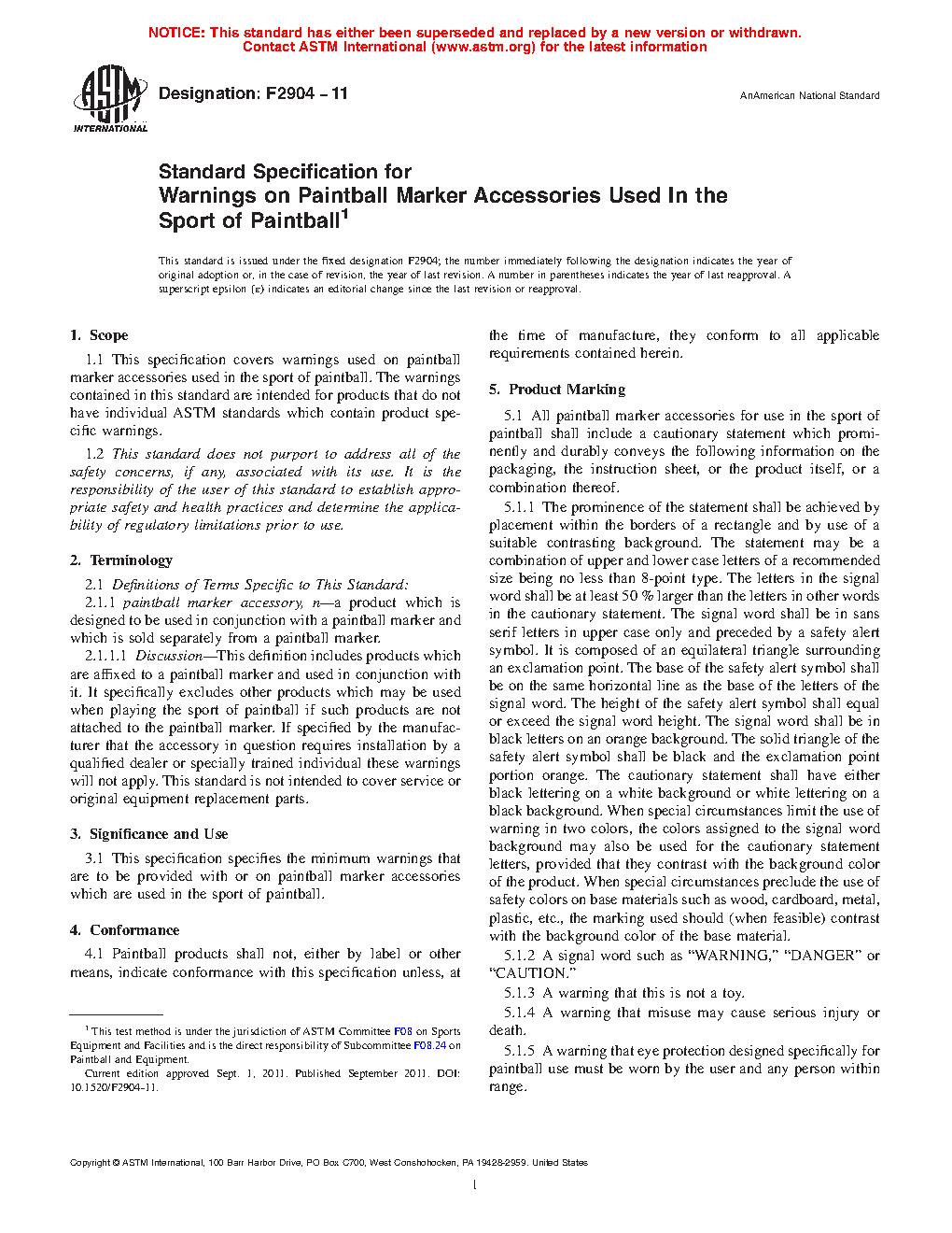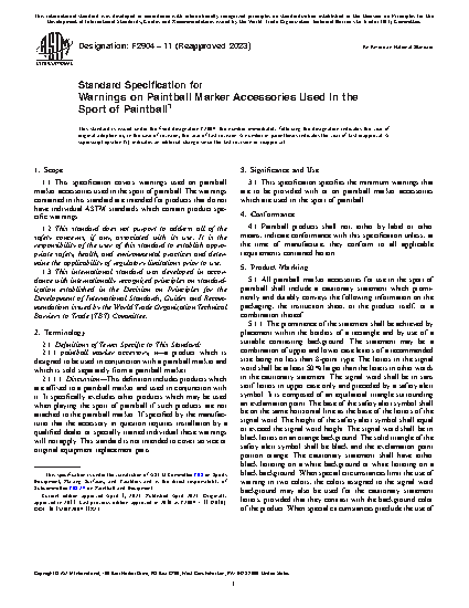 This specification covers warnings used on paintball marker accessories used in the sport of paintball. It states that all of the paintball marker accessories for use in the sport of paintball shall include a cautionary statement which prominently and durably conveys certain information on the instruction sheet, the packaging, or the product itself, or a combination thereof.