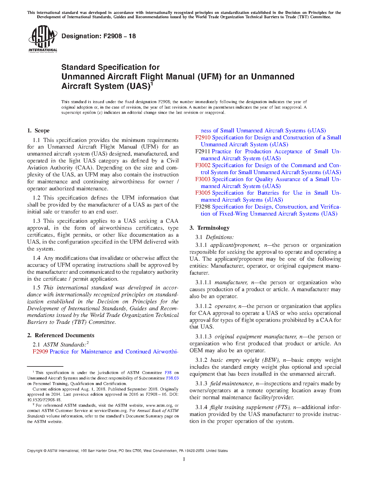 1.2 This specification defines the UFM information that shall be provided by the manufacturer of a UAS as part of the initial sale or transfer to an end user.