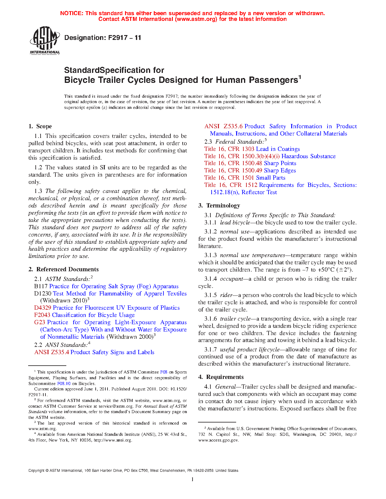 This specification covers trailer cycles, intended to be pulled behind bicycles, with seat post attachment, for transporting children. It includes test methods for confirming that this specification is satisfied.