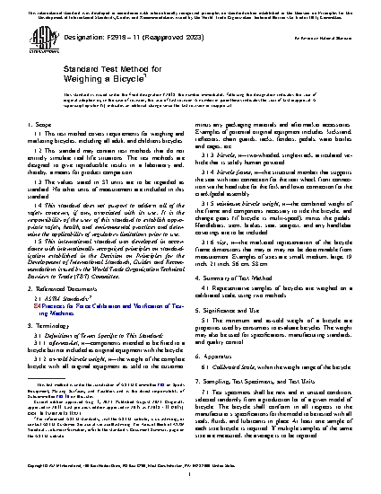 1.1 This test method covers requirements for weighing and marketing bicycles, including all adult, and childrens bicycles.