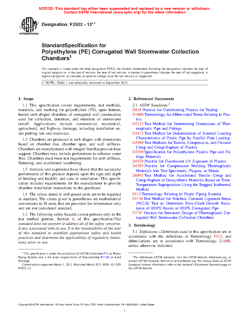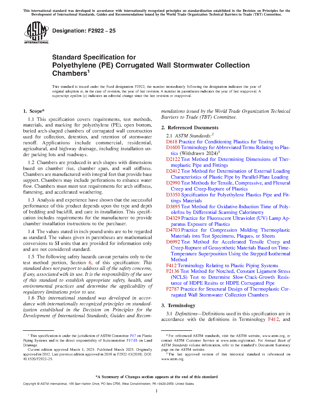 1.1 This specification covers requirements, test methods, materials, and marking for polyethylene (PE), open bottom, buried arch-shaped chambers of corrugated wall construction used for collection, detention, and retention of stormwater runoff. Applications include commercial, residential, agricultural, and highway drainage, including installation under parking lots and roadways.