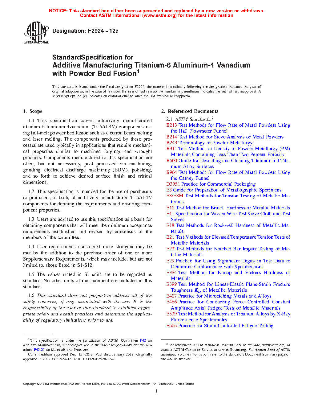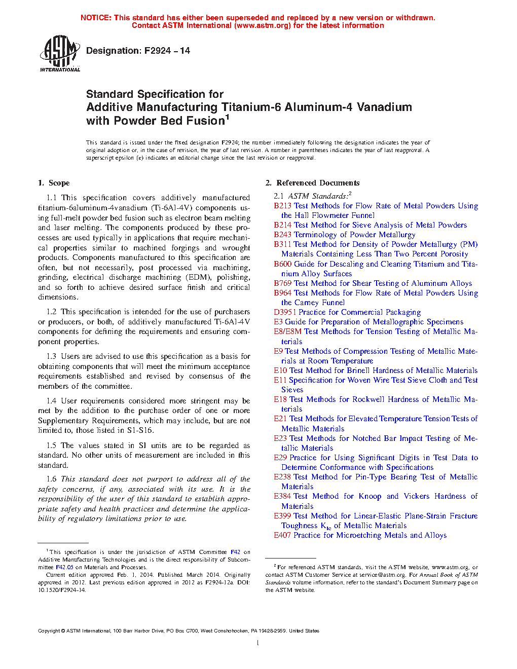 1.1 This specification covers additively manufactured titanium-6aluminum-4vanadium (Ti-6Al-4V) components using full-melt powder bed fusion such as electron beam melting and laser melting. The components produced by these processes are used typically in applications that require mechanical properties similar to machined forgings and wrought products. Components manufactured to this specification are often, but not necessarily, post processed via machining, grinding, electrical discharge machining (EDM), polishing, and so forth to achieve desired surface finish and critical dimensions.