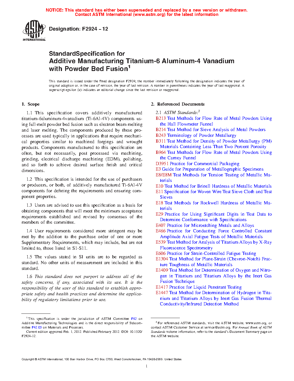 1.2 This specification is intended for the use of purchasers or producers, or both, of additively manufactured Ti-6Al-4V components for defining the requirements and ensuring component properties.