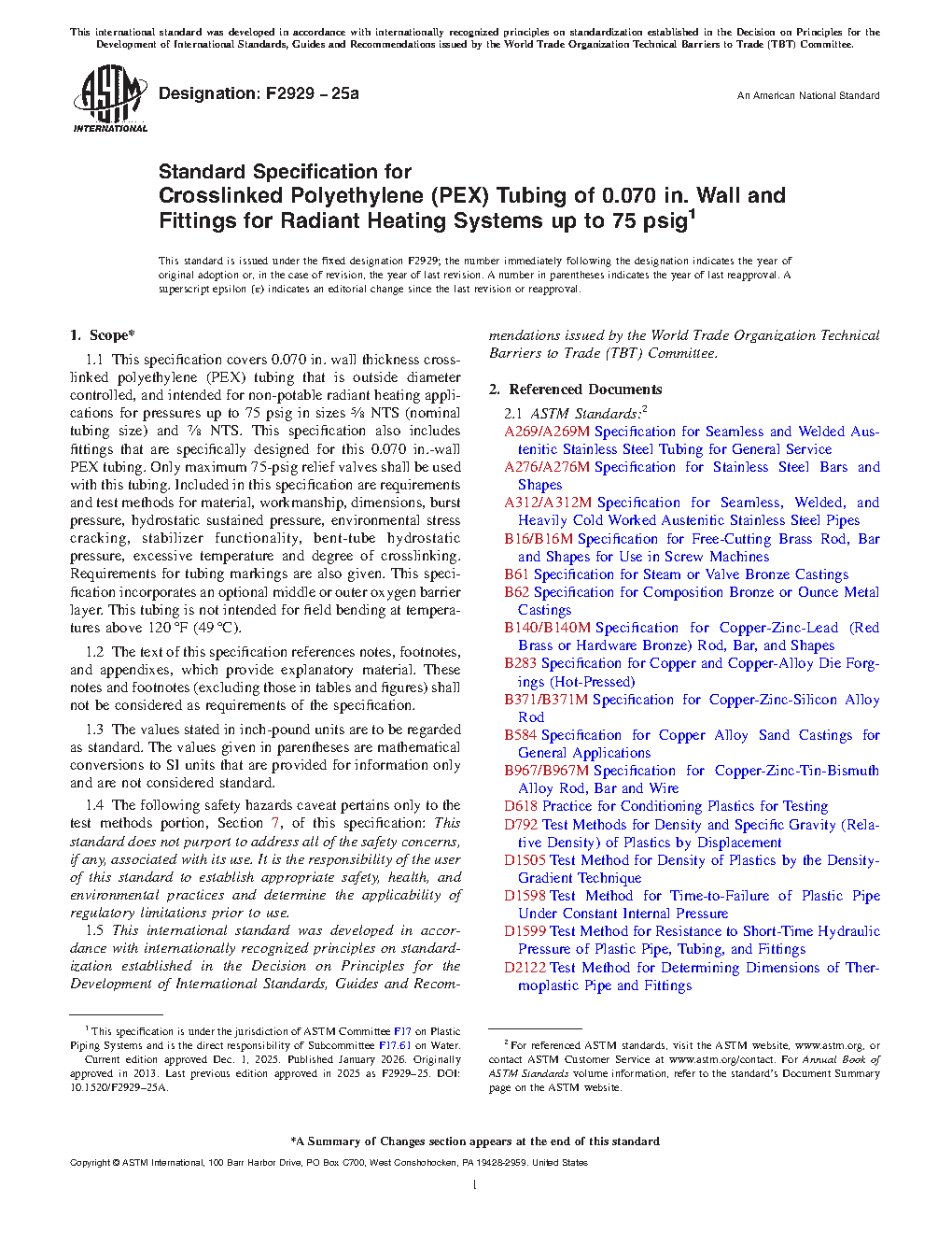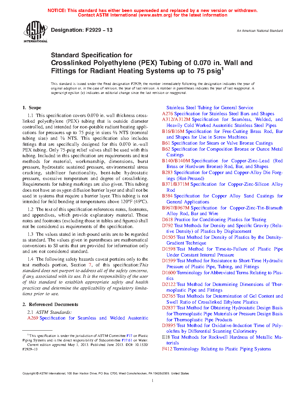 This specification establishes the requirements for 0.070 in. wall thickness crosslinked polyethylene (PEX) tubing that is outside diameter controlled, and intended for non-potable radiant heating applications for pressures up to 75 psig. It covers requirements and test methods for material, workmanship, dimensions, burst pressure, hydrostatic sustained pressure, bent-tube hydrostatic pressure, environmental stress cracking, stabilizer functionality, excessive temperature and degree of crosslinking, as well as requirements for tubing markings.