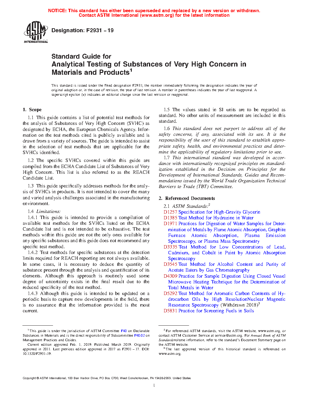 1.4.1 This guide is intended to provide a compilation of available test methods for the SVHCs listed on the ECHA Candidate list and is not intended to be exhaustive. The test methods within this guide are not the only ones available for any specific substances and this guide does not recommend any specific test method.