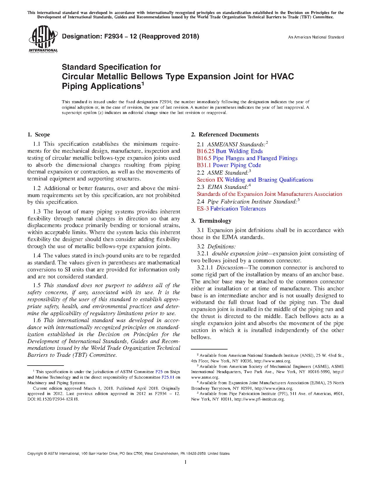 1.1 This specification establishes the minimum requirements for the mechanical design, manufacture, inspection and testing of circular metallic bellows-type expansion joints used to absorb the dimensional changes resulting from piping thermal expansion or contraction, as well as the movements of terminal equipment and supporting structures.
