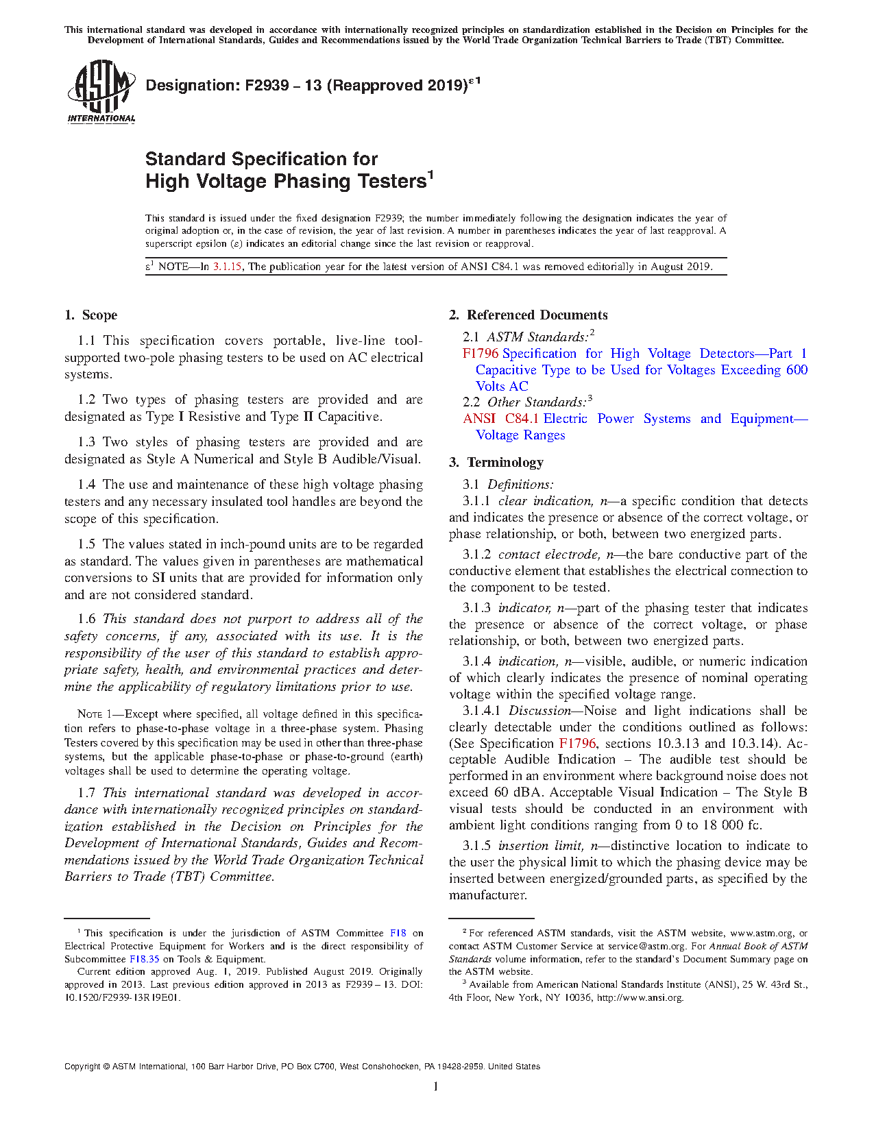 This specification defines the requirements for portable, live-line tool-supported two-pole phasing testers to be used on AC electrical systems. It provides two types of phasing testers, designated as Type I Resistive and Type II Capacitive, and two styles of phasing testers, designated as Style A Numerical and Style B Audible/Visual. It does not cover the use and maintenance of these high voltage phasing testers and any necessary insulated tool handles. The standard addresses ordering information for high voltage phasing testers, marking and instructions, workmanship, finish and appearance, testing, rejection and rehearing, certification, and precision and bias. Definitions of terms specific to this standard are provided, including clear indication, contact electrode, indicator, indication, insertion limit, interference field, interference ground, threshold angle, threshold voltage, and voltage range.