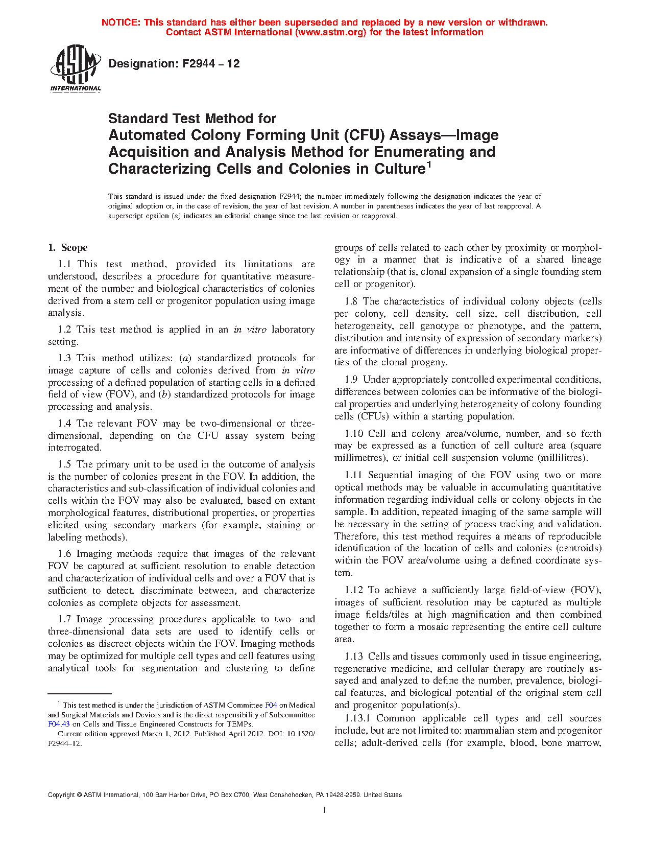 1.1 This practice, provided its limitations are understood, describes a procedure for quantitative measurement of the number and biological characteristics of colonies derived from a stem cell or progenitor population using image analysis.