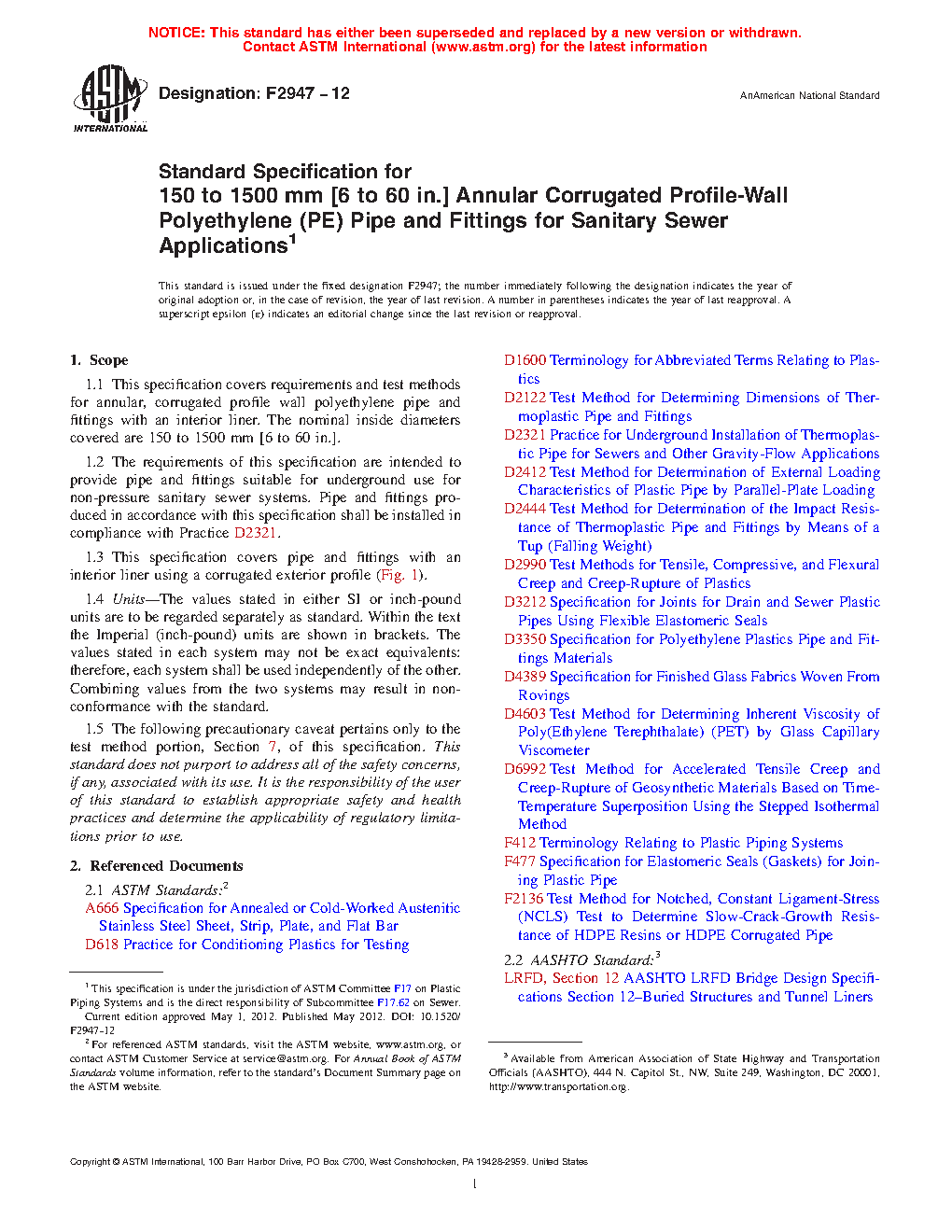 1.2 The requirements of this specification are intended to provide pipe and fittings suitable for underground use for non-pressure sanitary sewer systems. Pipe and fittings produced in accordance with this specification shall be installed in compliance with Practice D2321.