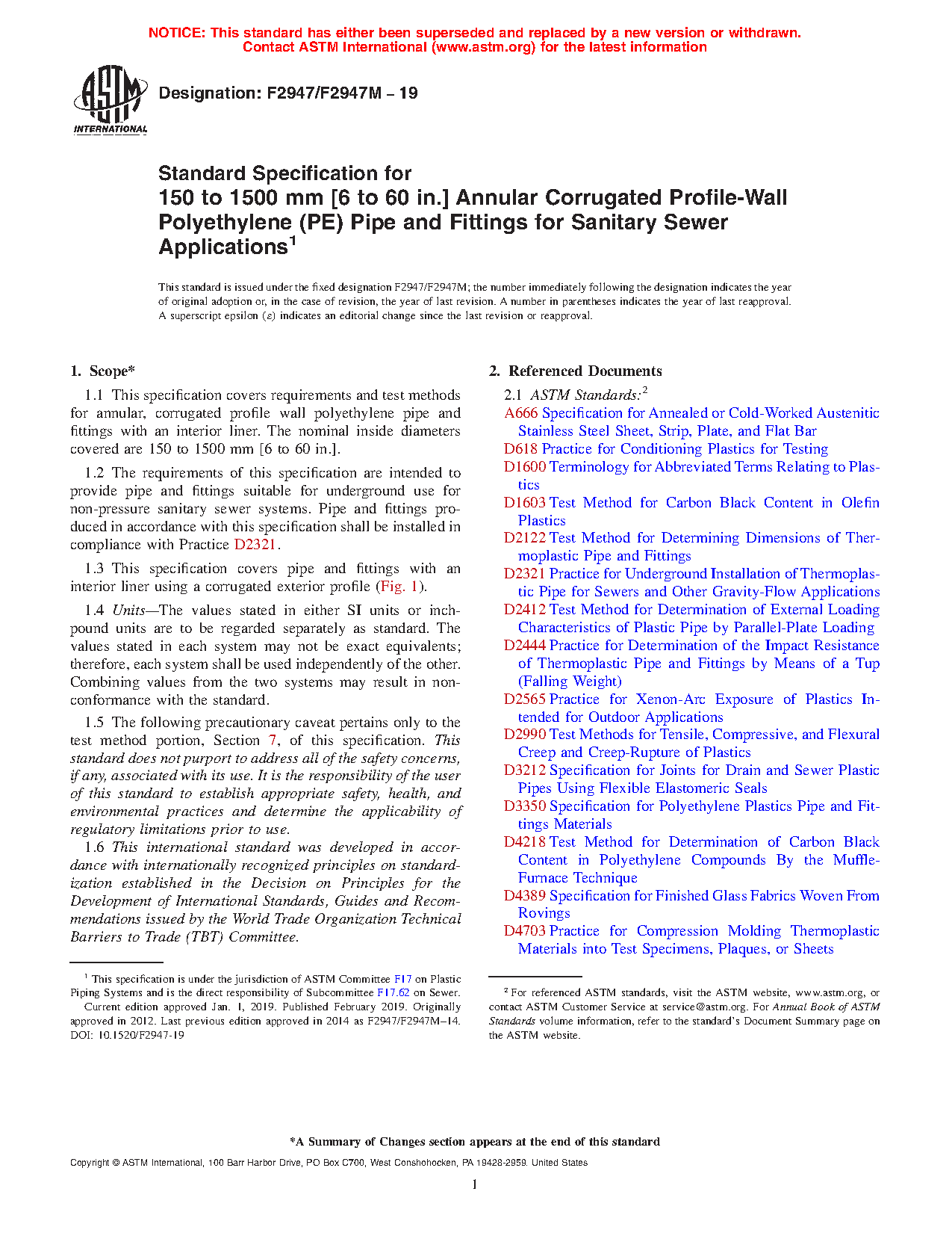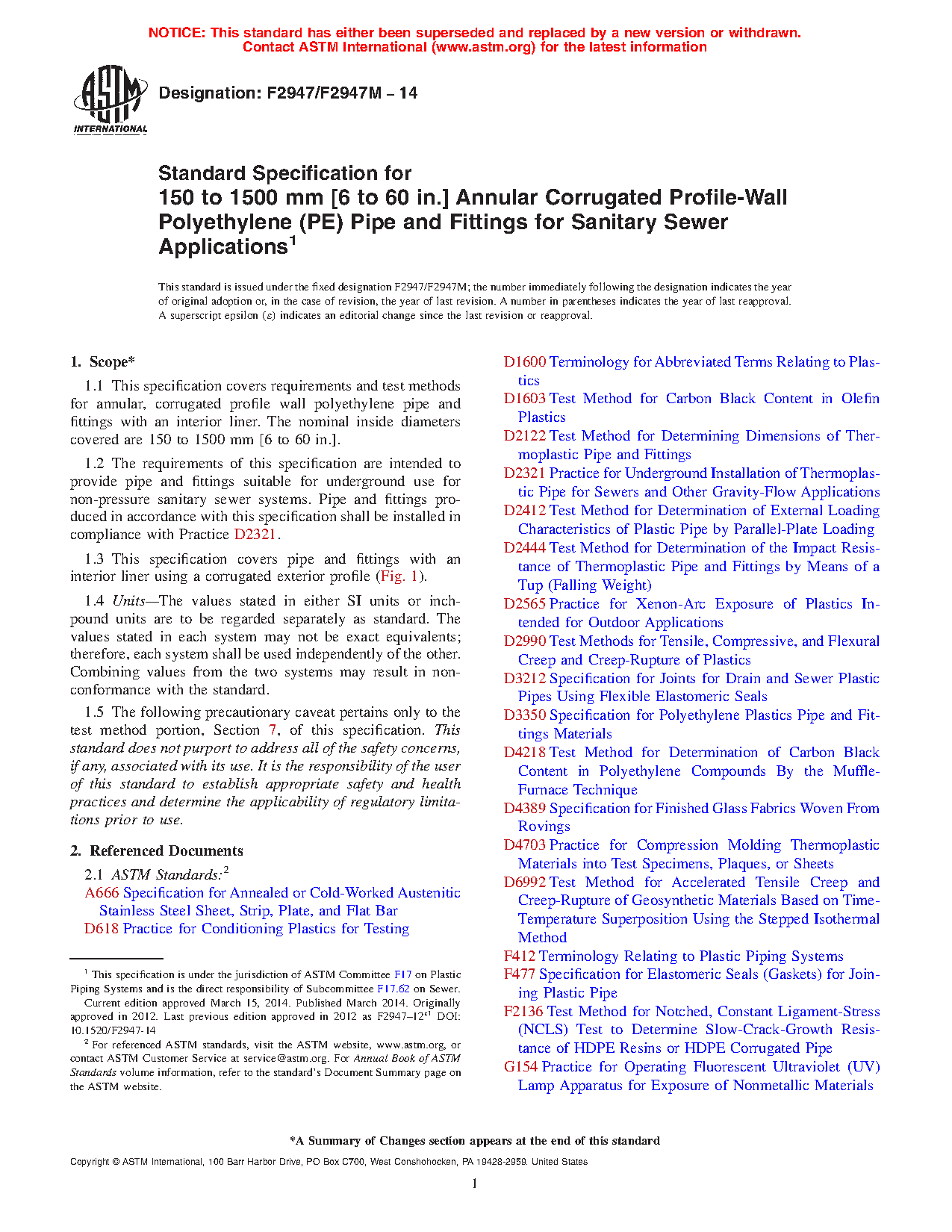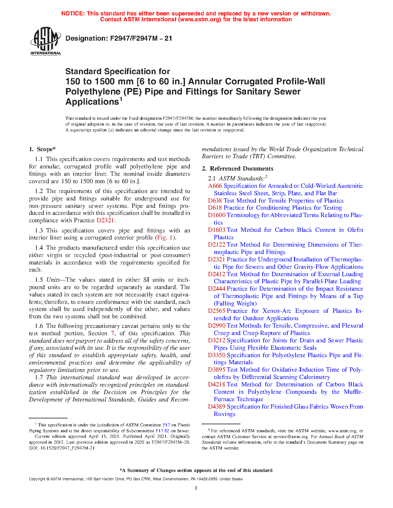 1.2 The requirements of this specification are intended to provide pipe and fittings suitable for underground use for non-pressure sanitary sewer systems. Pipe and fittings produced in accordance with this specification shall be installed in compliance with Practice D2321.