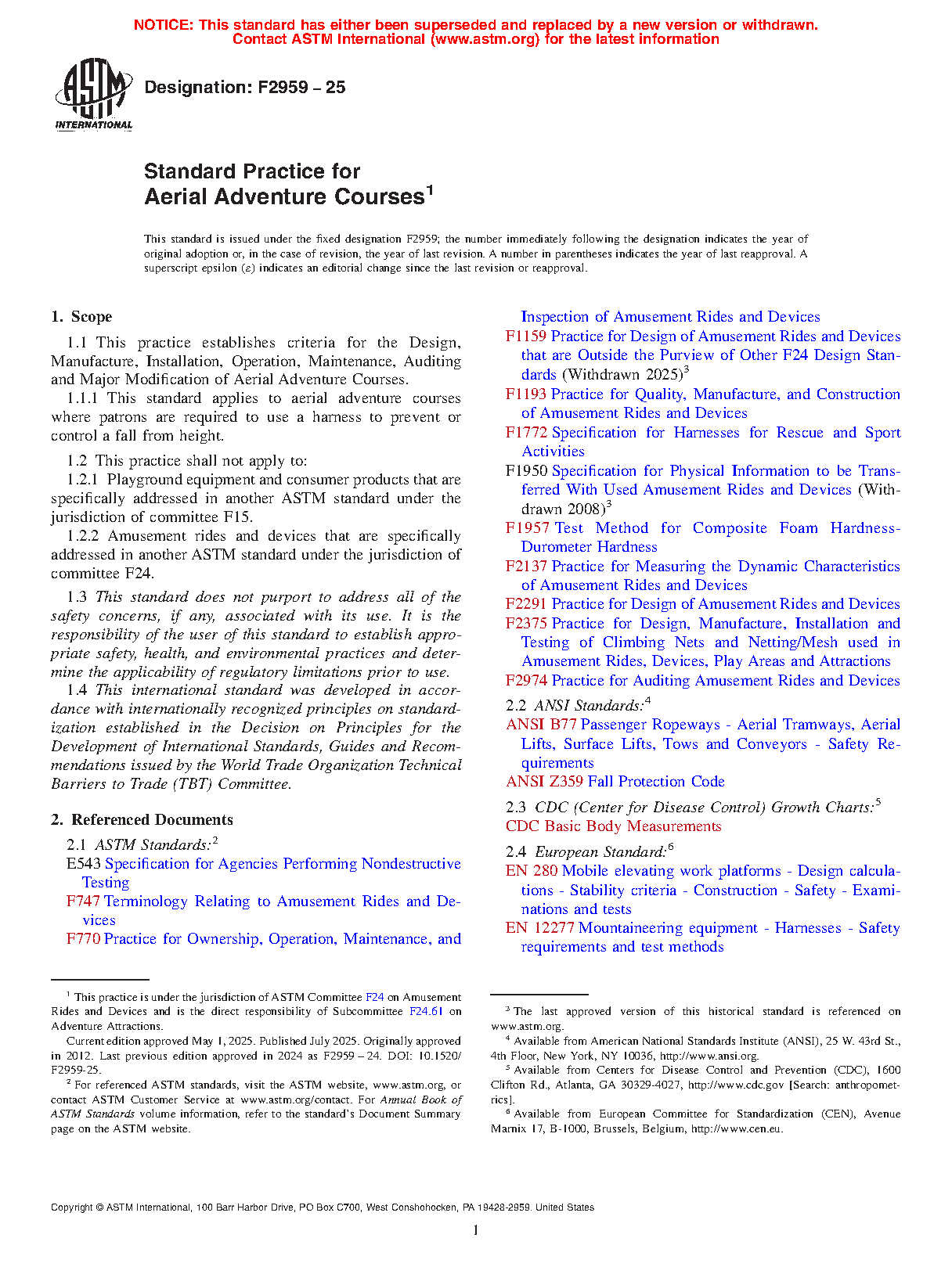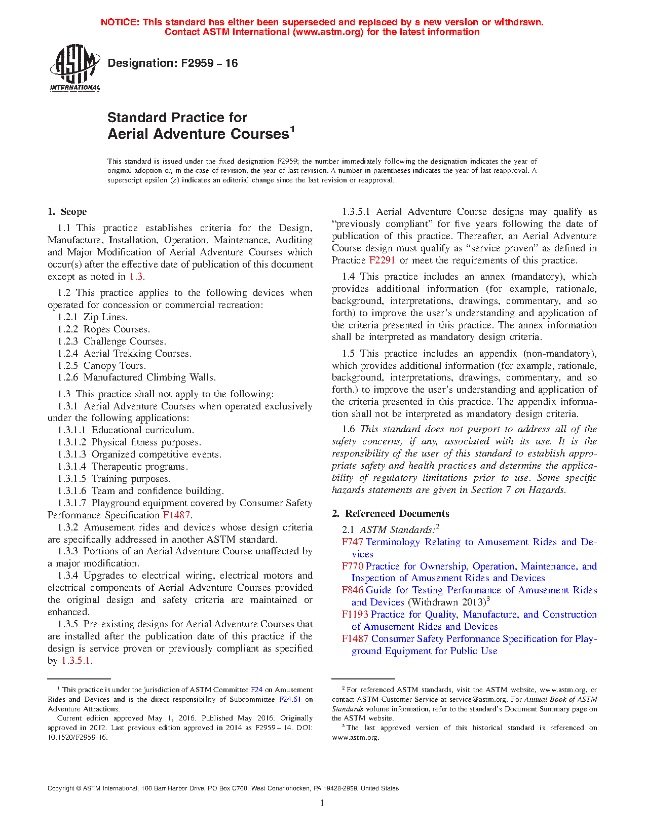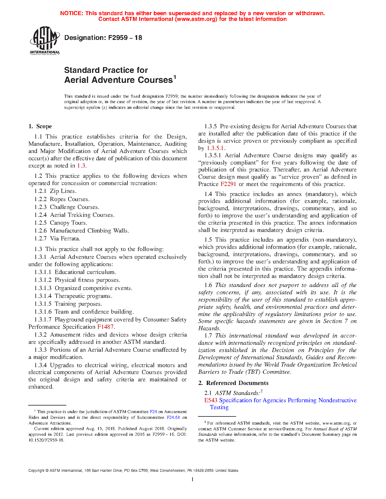1.1 This practice establishes criteria for the Design, Manufacture, Installation, Operation, Maintenance, Auditing and Major Modification of Aerial Adventure Courses which occur(s) after the effective date of publication of this document except as noted in 1.3.