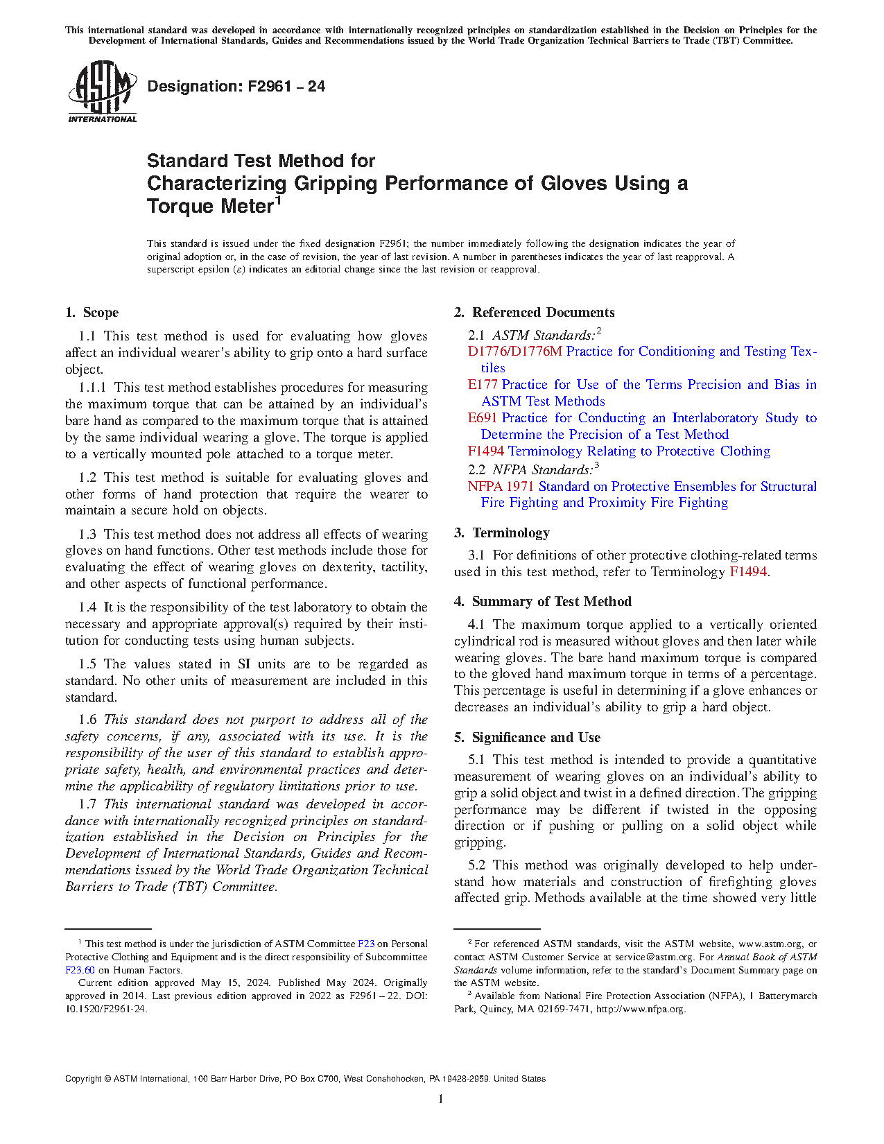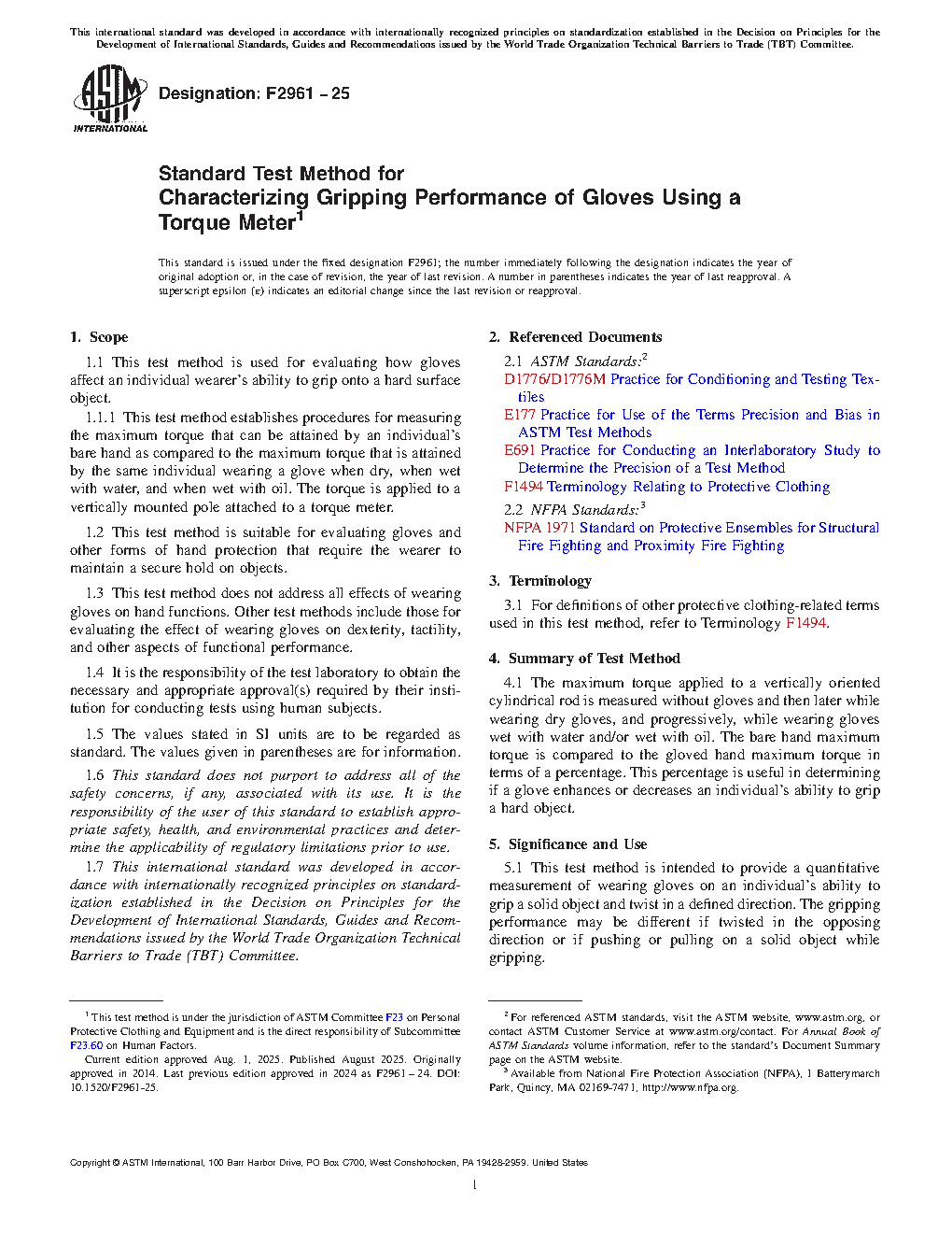 5.2 This method was originally developed to help understand how materials and construction of firefighting gloves affected grip. Methods available at the time showed very little statistical difference between a wide range of gloves, including many NFPA 1971 compliant firefighting gloves and also non-compliant gloves used in other applications. This method was shown to have less subject-to-subject variability and a greater range of measured grip than previous tests.4