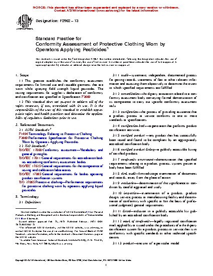1.1 This practice establishes the conformity assessment requirements for limited use and reusable garments that are worn while spraying field strength liquid pesticides. The testing requirements for supplier’s declaration of conformity and certification are specified in Specification F2669.