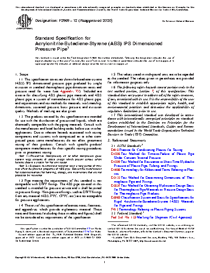 This specification covers acrylonitrile-butadiene-styrene (ABS) IPS dimensioned pressure pipe produced by single extrusion in standard thermoplastic pipe dimension ratios and pressure rated for water. It includes criteria for classifying ABS plastic pipe materials and ABS plastic pipe, a system of nomenclature for ABS plastic pipe, and requirements and test methods for materials, workmanship, dimensions, sustained pressure, burst pressure, and extrusion quality. Methods of marking are also given. The products covered by this specification are intended for use with the distribution of pressurized liquids, which are chemically compatible with the piping materials. This specification deals with materials and requirements, pipe classification, test methods, retest and rejection, marking, and quality assurance.