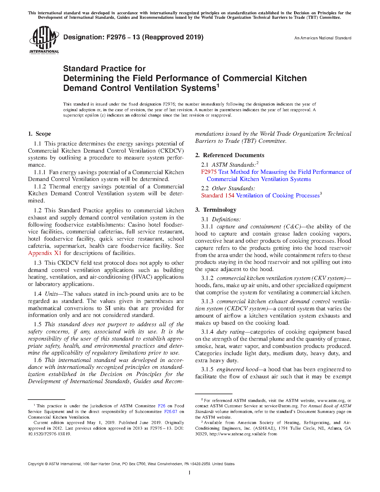 1.1 This practice determines the energy savings potential of Commercial Kitchen Demand Control Ventilation (CKDCV) systems by outlining a procedure to measure system performance.