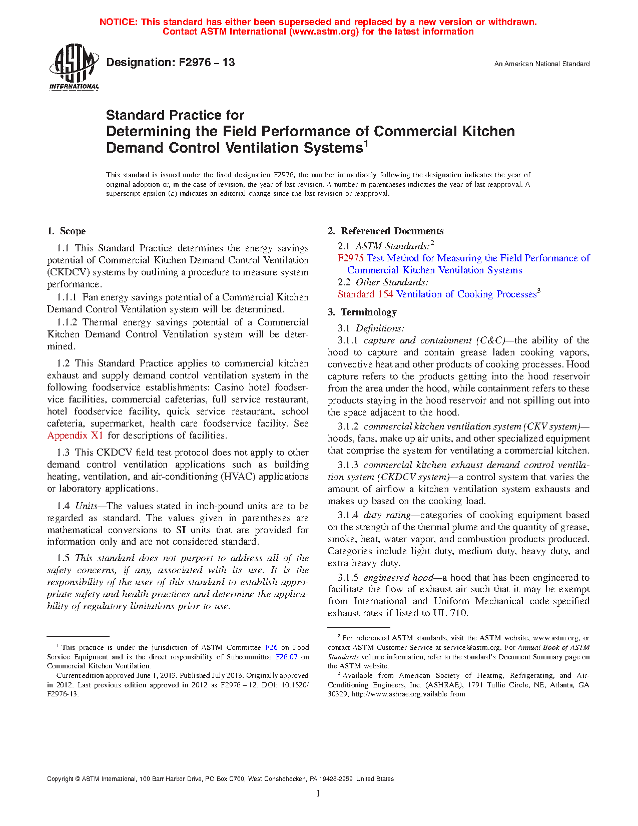 1.2 This Standard Practice applies to commercial kitchen exhaust and supply demand control ventilation system in the following foodservice establishments: Casino hotel foodservice facilities, commercial cafeterias, full service restaurant, hotel foodservice facility, quick service restaurant, school cafeteria, supermarket, health care foodservice facility. See Appendix X1 for descriptions of facilities.